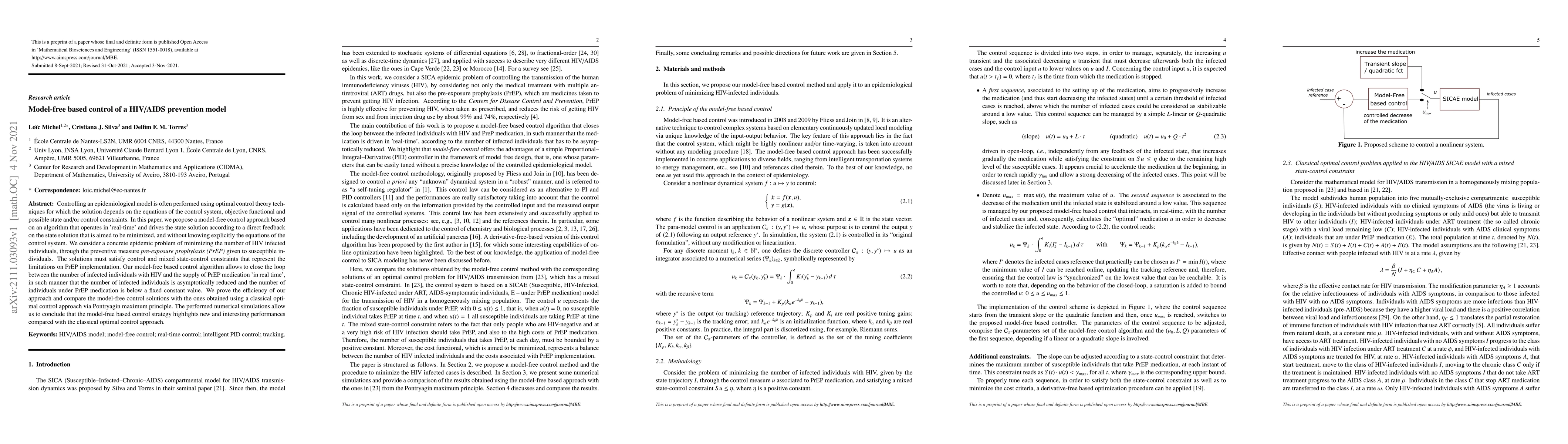 Controlling an epidemiological model is often performed using optimal control theory techniques for which the solution depends on the equations of the control system, objective functional and possible state and/or control constraints. In this paper, we propose a model-free control approach based on an algorithm that operates in 'real-time' and drives the state solution according to a direct feedback on the state solution that is aimed to be minimized, and without knowing explicitly the equations of the control system. We consider a concrete epidemic problem of minimizing the number of HIV infected individuals, through the preventive measure pre-exposure prophylaxis (PrEP) given to susceptible individuals. The solutions must satisfy control and mixed state-control constraints that represent the limitations on PrEP implementation. Our model-free based control algorithm allows to close the loop between the number of infected individuals with HIV and the supply of PrEP medication 'in real time', in such manner that the number of infected individuals is asymptotically reduced and the number of individuals under PrEP medication is below a fixed constant value. We prove the efficiency of our approach and compare the model-free control solutions with the ones obtained using a classical optimal control approach via Pontryagin maximum principle. The performed numerical simulations allow us to conclude that the model-free based control strategy highlights new and interesting performances compared with the classical optimal control approach.