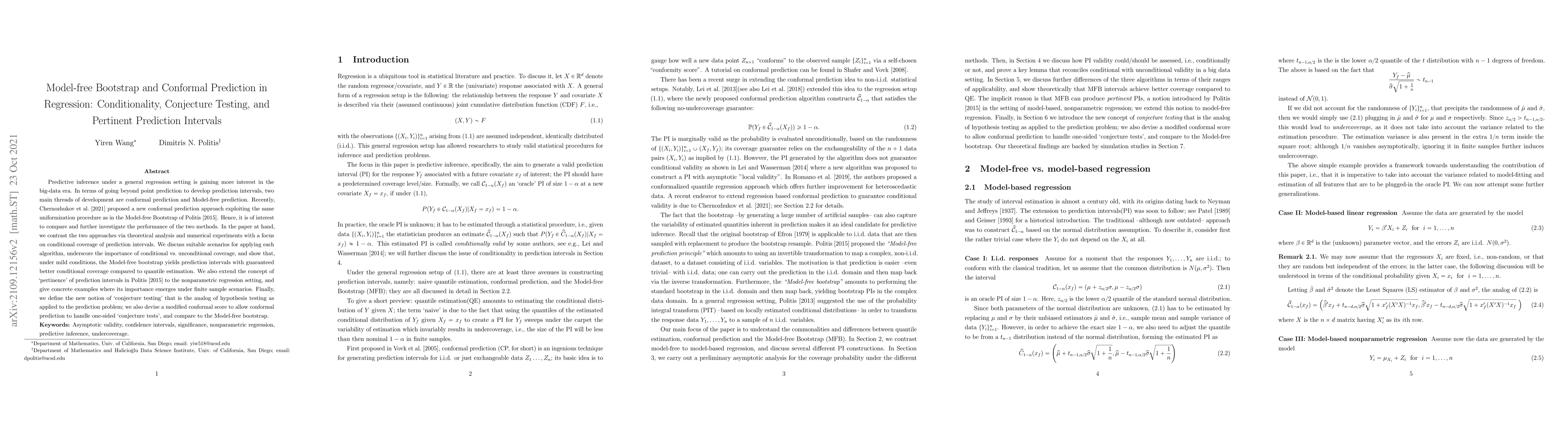 Predictive inference under a general regression setting is gaining more interest in the big-data era. In terms of going beyond point prediction to develop prediction intervals, two main threads of development are conformal prediction and Model-free prediction. Recently, Chernozhukov et al.(2021) proposed a new conformal prediction approach exploiting the same uniformization procedure as in the Model-free Bootstrap of Politis (2015). Hence, it is of interest to compare and further investigate the performance of the two methods. In the paper at hand, we contrast the two approaches via theoretical analysis and numerical experiments with a focus on conditional coverage of prediction intervals. We discuss suitable scenarios for applying each algorithm, underscore the importance of conditional vs. unconditional coverage, and show that, under mild conditions, the Model-free bootstrap yields prediction intervals with guaranteed better conditional coverage compared to quantile estimation. We also extend the concept of `pertinence' of prediction intervals in Politis (2015) to the nonparametric regression setting, and give concrete examples where its importance emerges under finite sample scenarios. Finally, we define the new notion of `conjecture testing' that is the analog of hypothesis testing as applied to the prediction problem; we also devise a modified conformal score to allow conformal prediction to handle one-sided 'conjecture tests', and compare to the Model-free bootstrap.