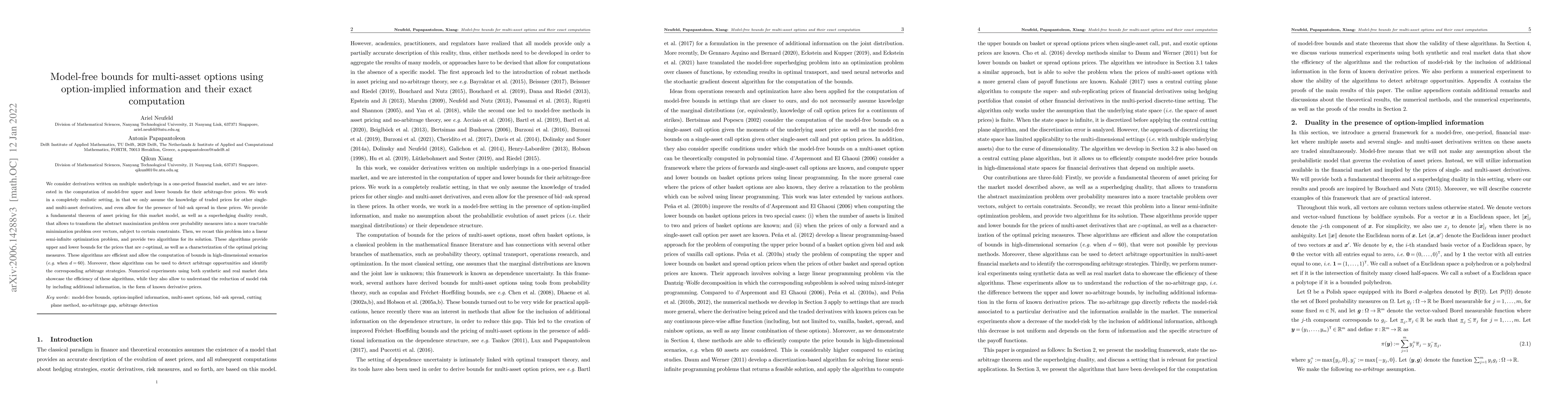This paper develops model-free bounds for multi-asset option prices using option-implied information and provides efficient algorithms for their exact computation. It leverages traded prices of single- and multi-asset derivatives, and includes bid-ask spreads, to compute arbitrage-free upper and lower bounds, transforming the problem into a linear semi-infinite optimization.