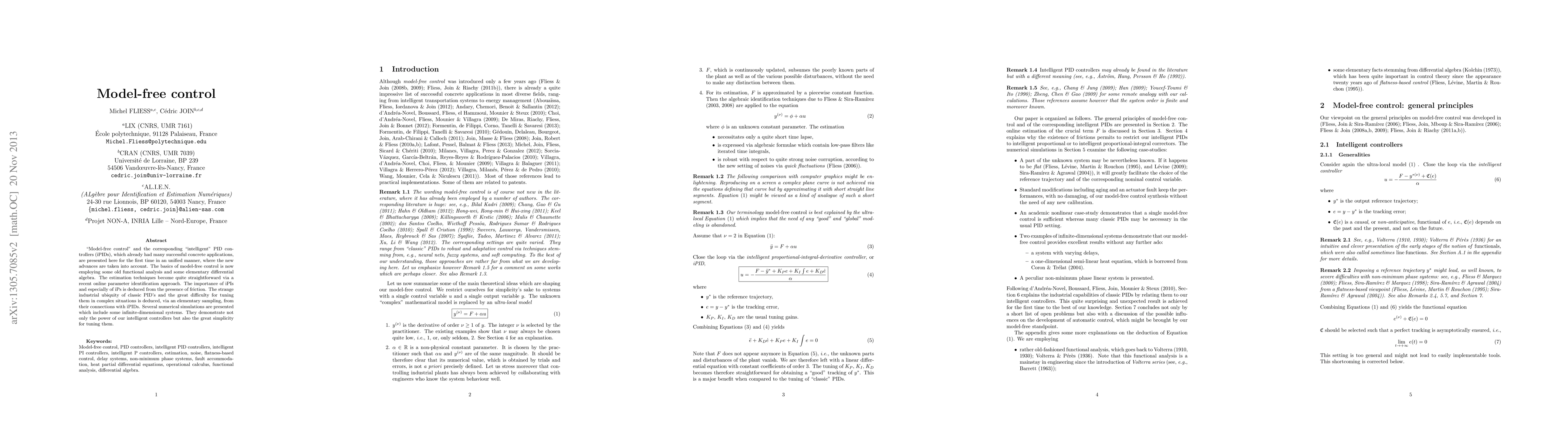 "Model-free control" and the corresponding "intelligent" PID controllers (iPIDs), which already had many successful concrete applications, are presented here for the first time in an unified manner, where the new advances are taken into account. The basics of model-free control is now employing some old functional analysis and some elementary differential algebra. The estimation techniques become quite straightforward via a recent online parameter identification approach. The importance of iPIs and especially of iPs is deduced from the presence of friction. The strange industrial ubiquity of classic PID's and the great difficulty for tuning them in complex situations is deduced, via an elementary sampling, from their connections with iPIDs. Several numerical simulations are presented which include some infinite-dimensional systems. They demonstrate not only the power of our intelligent controllers but also the great simplicity for tuning them.
