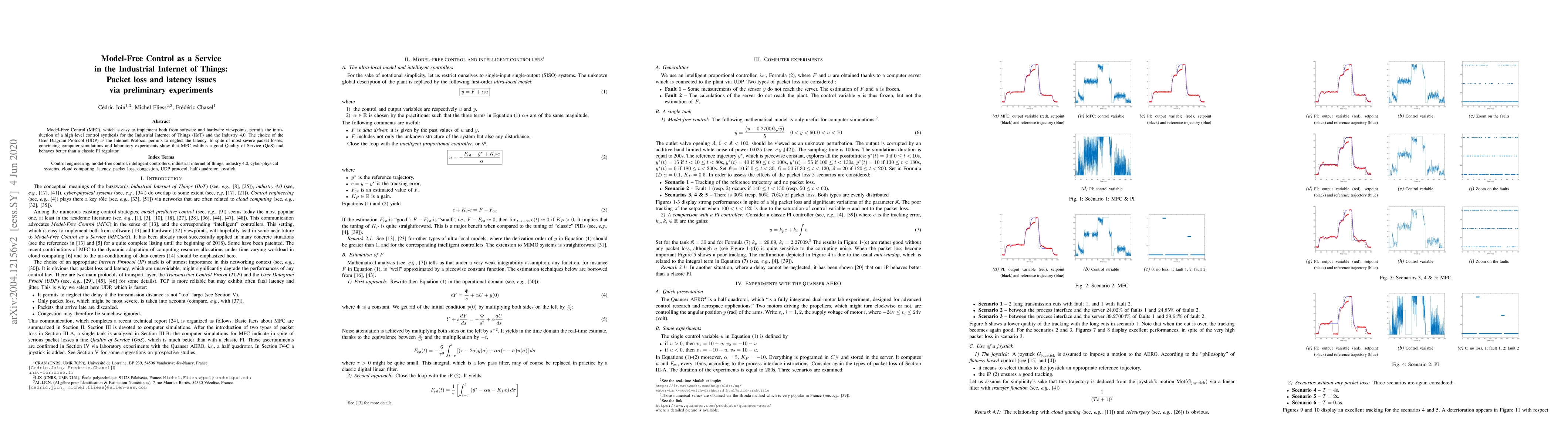 Model-Free Control (MFC), which is easy to implement both from software and hardware viewpoints, permits the introduction of a high level control synthesis for the Industrial Internet of Things (IIoT) and the Industry 4.0. The choice of the User Diagram Protocol (UDP) as the Internet Protocol permits to neglect the latency. In spite of most severe packet losses, convincing computer simulations and laboratory experiments show that MFC exhibits a good Quality of Service (QoS) and behaves better than a classic PI regulator.
