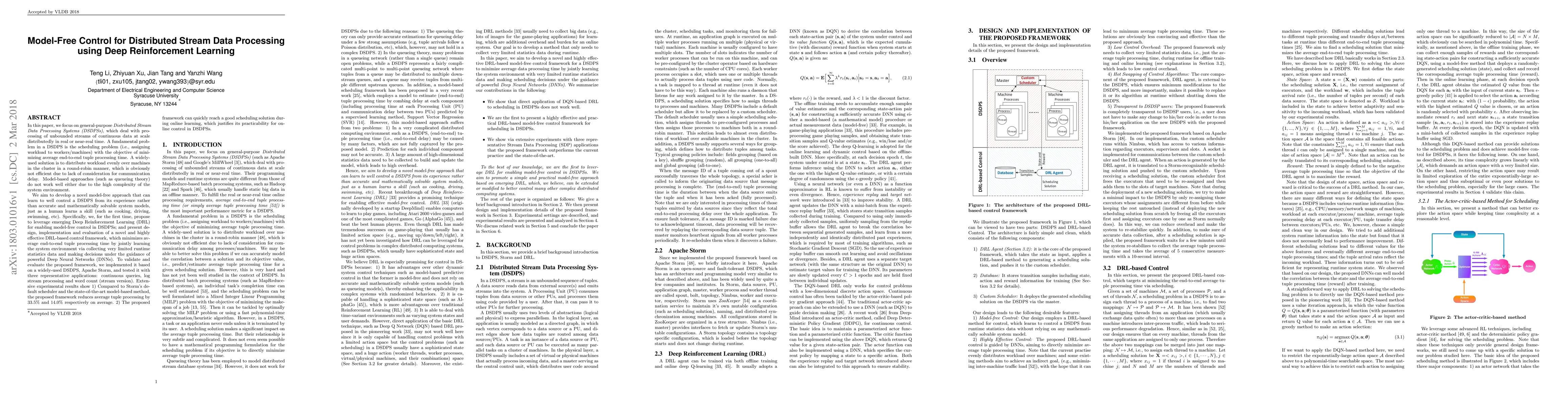 This paper proposes a Deep Reinforcement Learning (DRL) based model-free control framework for Distributed Stream Data Processing Systems (DSDPSs) to minimize average processing time. The framework learns from limited runtime statistics and outperforms both default and model-based scheduling methods, achieving a 33.5% reduction compared to the default scheduler.