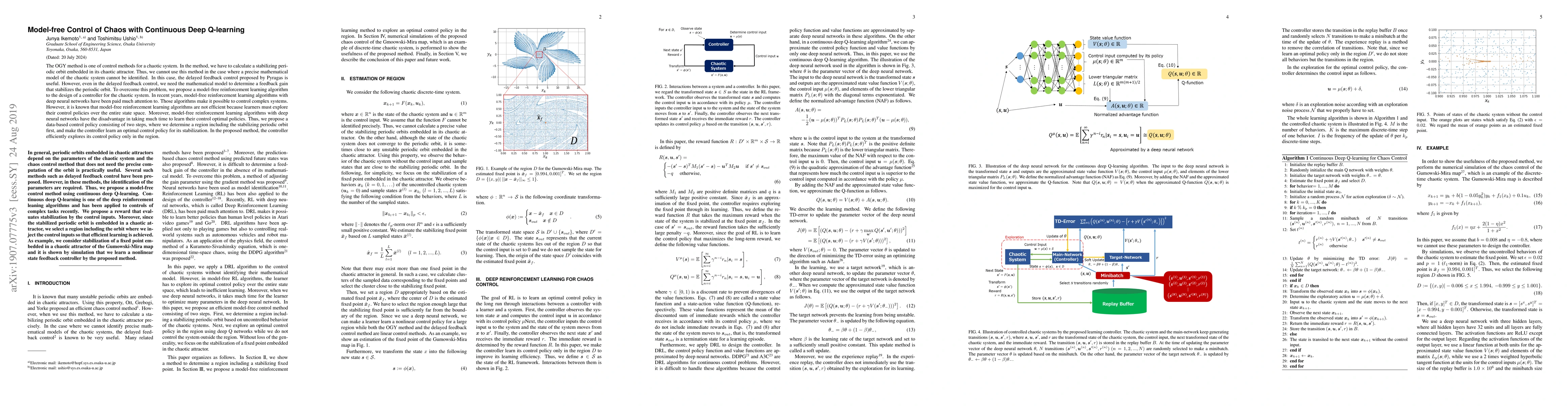 This paper proposes a model-free reinforcement learning algorithm using continuous deep Q-learning to control chaotic systems without requiring a precise mathematical model. The method efficiently determines a region around the stabilizing periodic orbit and trains the controller to optimize its policy within this region, thus reducing exploration time.