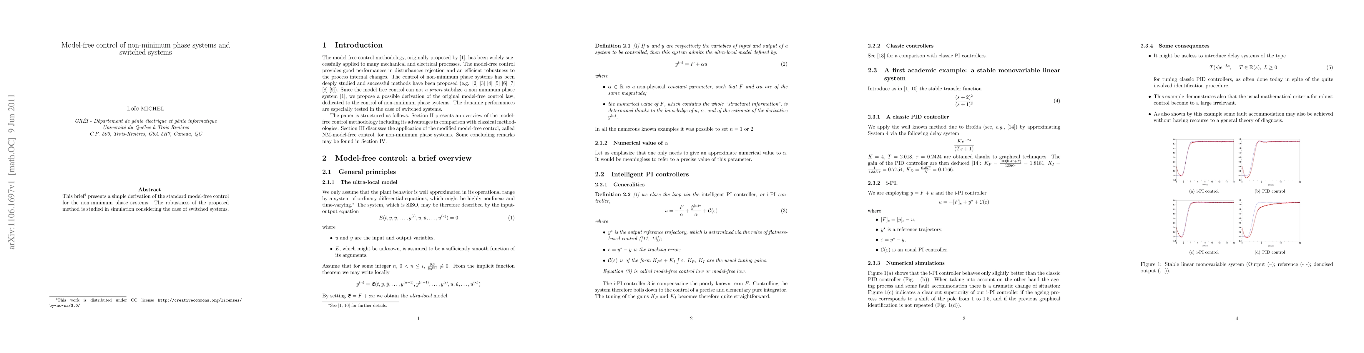 This paper proposes a model-free control method for non-minimum phase systems and switched systems, demonstrating its robustness in simulation scenarios.