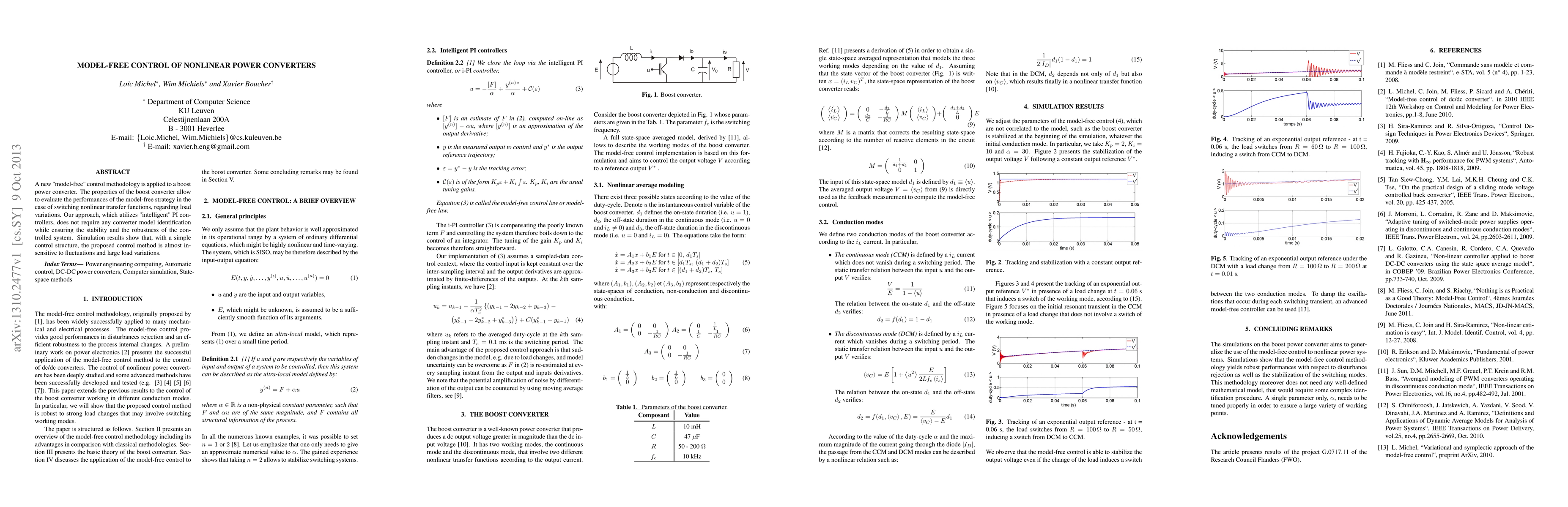 A new "model-free" control methodology is applied to a boost power converter. The properties of the boost converter allow to evaluate the performances of the model-free strategy in the case of switching nonlinear transfer functions, regarding load variations. Our approach, which utilizes "intelligent" PI controllers, does not require any converter model identification while ensuring the stability and the robustness of the controlled system. Simulation results show that, with a simple control structure, the proposed control method is almost insensitive to fluctuations and large load variations.