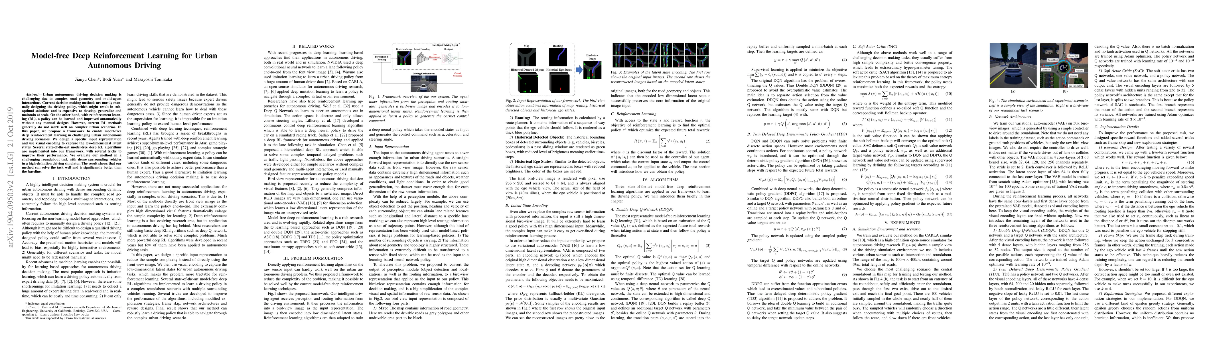 This paper proposes a model-free deep reinforcement learning framework for urban autonomous driving, utilizing visual encoding to capture latent states and improving state-of-the-art RL algorithms. The method is evaluated in a complex roundabout task, demonstrating superior performance compared to baselines.