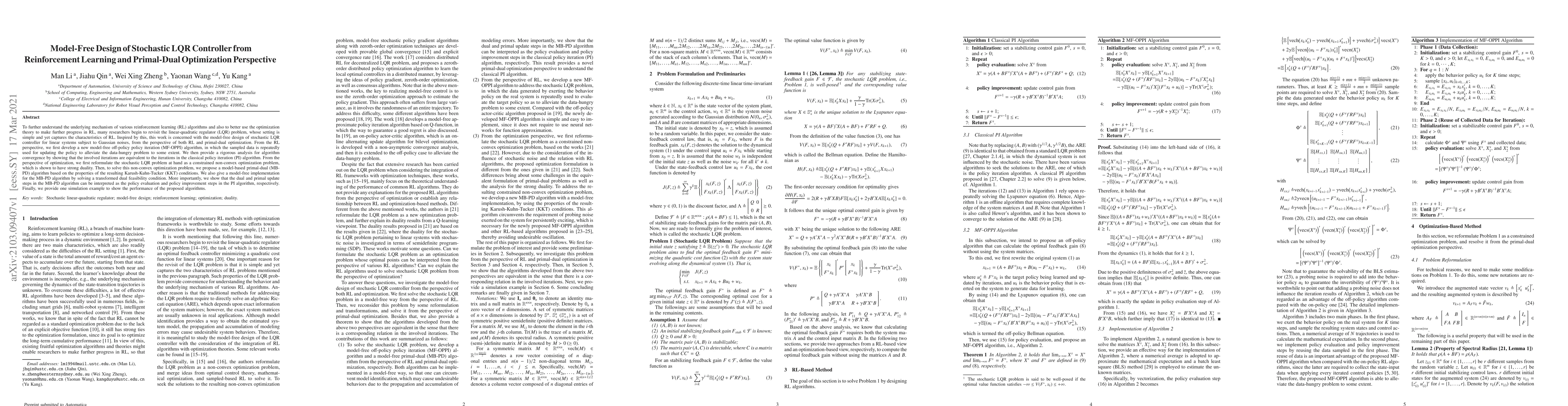 This paper proposes a model-free design for stochastic LQR controllers using reinforcement learning and primal-dual optimization. It introduces a new model-free off-policy policy iteration (MF-OPPI) algorithm and a model-based primal-dual (MB-PD) algorithm, demonstrating their equivalence to classical policy iteration and strong duality in optimization.