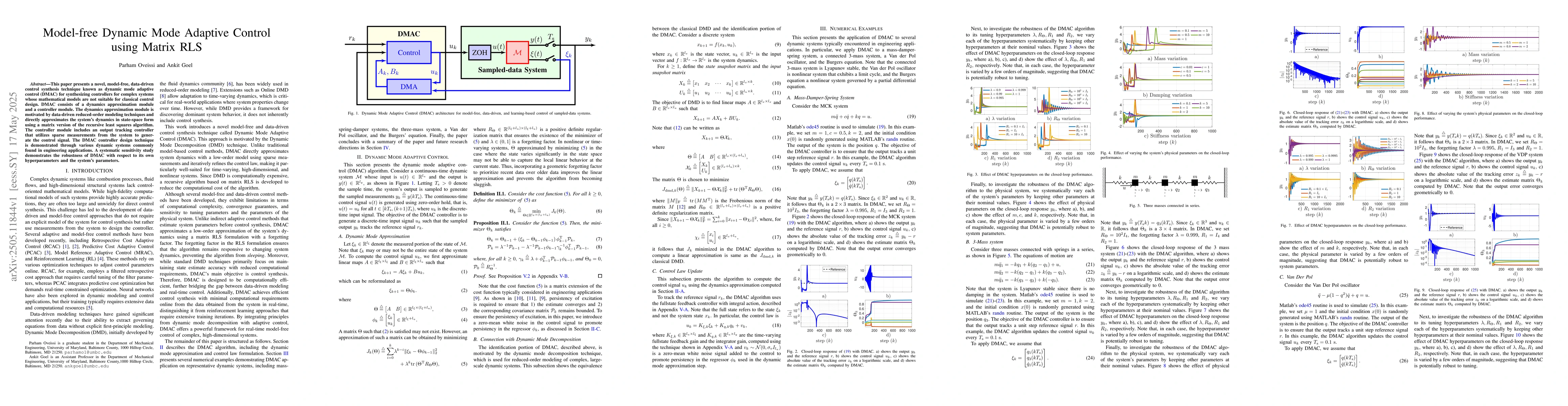 The research introduces Dynamic Mode Adaptive Control (DMAC), a model-free, data-driven control synthesis technique. DMAC comprises a dynamics approximation module using matrix Recursive Least Squares (RLS) for state-space form approximation, and a controller module with an output tracking controller utilizing sparse system measurements.