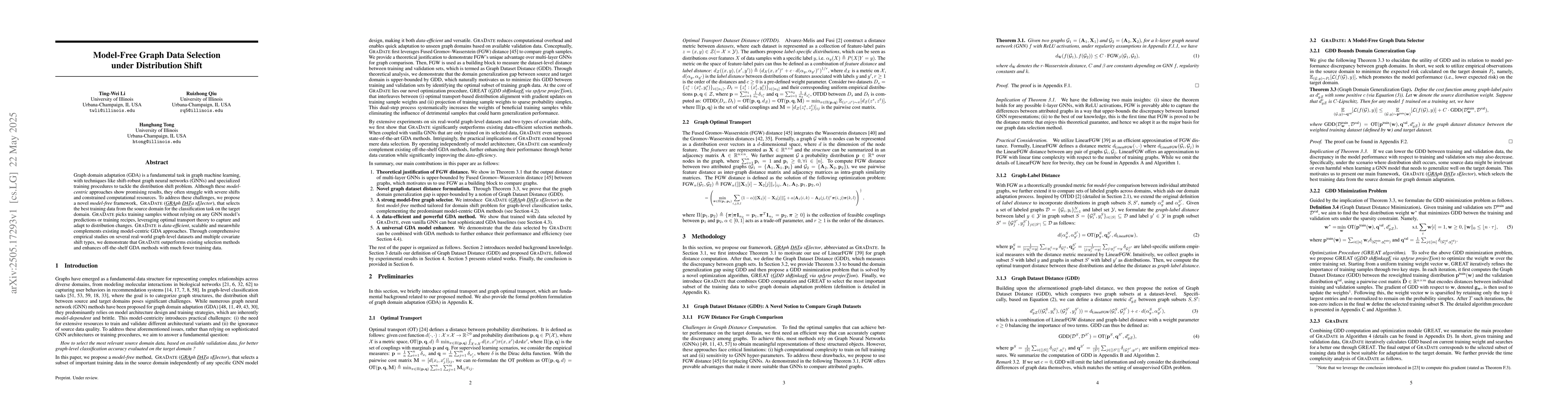 GRADATE proposes a model-free framework that selects the best training data for graph domain adaptation, leveraging optimal transport theory to capture distribution changes. It outperforms existing selection methods and enhances off-the-shelf GDA methods with fewer training data.