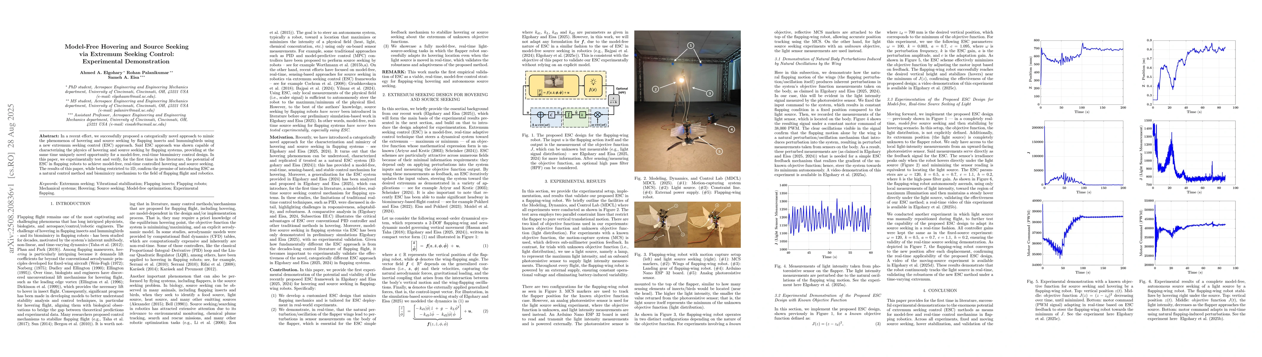 In a recent effort, we successfully proposed a categorically novel approach to mimic the phenomenoa of hovering and source seeking by flapping insects and hummingbirds using a new extremum seeking control (ESC) approach. Said ESC approach was shown capable of characterizing the physics of hovering and source seeking by flapping systems, providing at the same time uniquely novel opportunity for a model-free, real-time biomimicry control design. In this paper, we experimentally test and verify, for the first time in the literature, the potential of ESC in flapping robots to achieve model-free, real-time controlled hovering and source seeking. The results of this paper, while being restricted to 1D, confirm the premise of introducing ESC as a natural control method and biomimicry mechanism to the field of flapping flight and robotics.