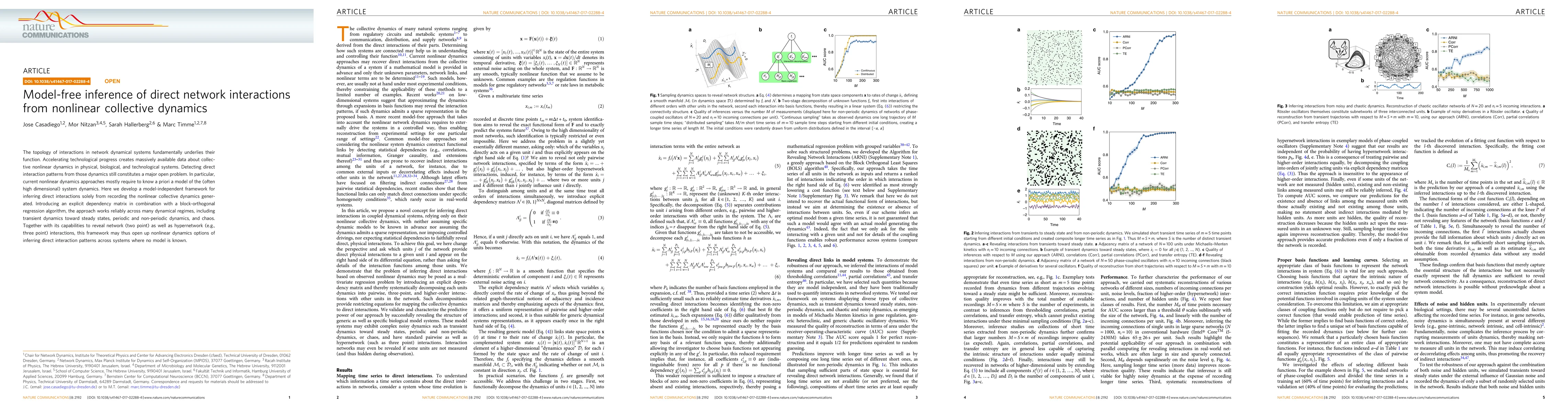 The topology of interactions in network dynamical systems fundamentally underlies their function. Accelerating technological progress creates massively available data about collective nonlinear dynamics in physical, biological, and technological systems. Detecting direct interaction patterns from those dynamics still constitutes a major open problem. In particular, current nonlinear dynamics approaches mostly require to know a priori a model of the (often high dimensional) system dynamics. Here we develop a model-independent framework for inferring direct interactions solely from recording the nonlinear collective dynamics generated. Introducing an explicit dependency matrix in combination with a block-orthogonal regression algorithm, the approach works reliably across many dynamical regimes, including transient dynamics toward steady states, periodic and non-periodic dynamics, and chaos. Together with its capabilities to reveal network (two point) as well as hypernetwork (e.g., three point) interactions, this framework may thus open up nonlinear dynamics options of inferring direct interaction patterns across systems where no model is known.
