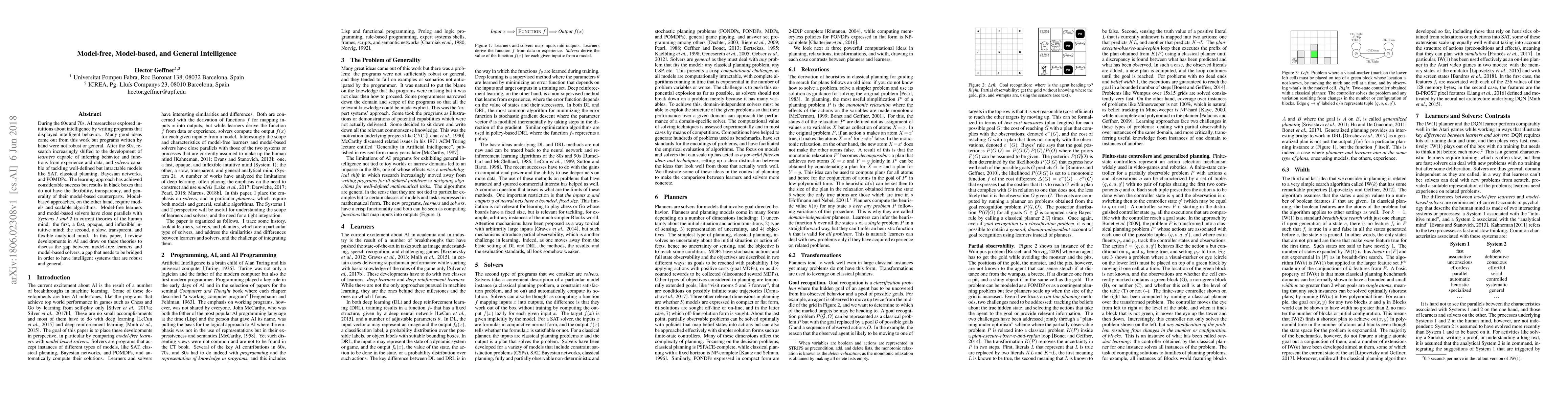 During the 60s and 70s, AI researchers explored intuitions about intelligence by writing programs that displayed intelligent behavior. Many good ideas came out from this work but programs written by hand were not robust or general. After the 80s, research increasingly shifted to the development of learners capable of inferring behavior and functions from experience and data, and solvers capable of tackling well-defined but intractable models like SAT, classical planning, Bayesian networks, and POMDPs. The learning approach has achieved considerable success but results in black boxes that do not have the flexibility, transparency, and generality of their model-based counterparts. Model-based approaches, on the other hand, require models and scalable algorithms. Model-free learners and model-based solvers have close parallels with Systems 1 and 2 in current theories of the human mind: the first, a fast, opaque, and inflexible intuitive mind; the second, a slow, transparent, and flexible analytical mind. In this paper, I review developments in AI and draw on these theories to discuss the gap between model-free learners and model-based solvers, a gap that needs to be bridged in order to have intelligent systems that are robust and general.
