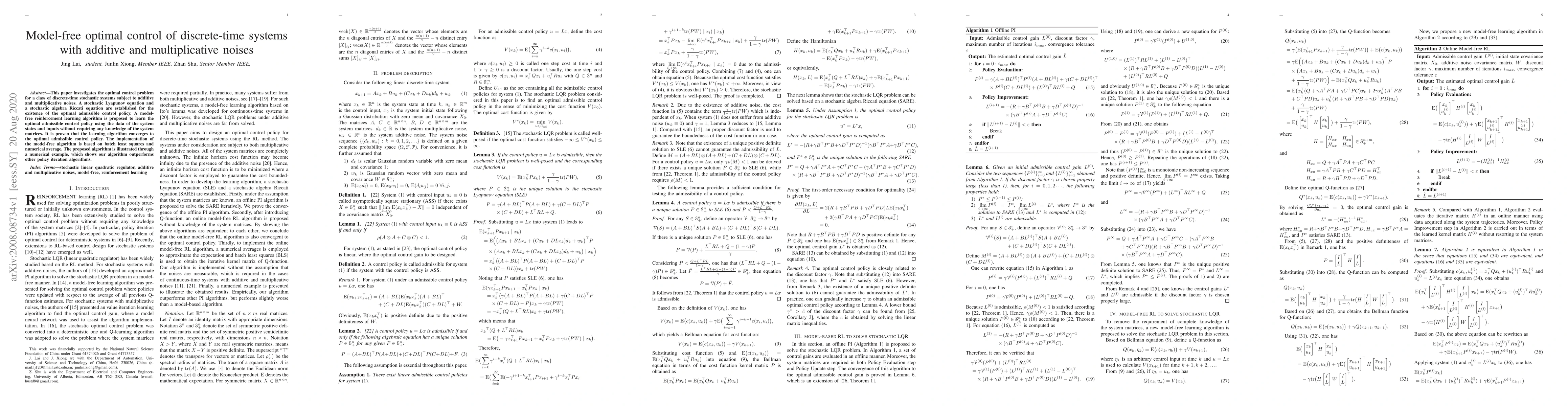 This paper proposes a model-free reinforcement learning algorithm for optimal control of discrete-time stochastic systems with additive and multiplicative noises, using batch least squares and numerical average. The algorithm is proven to converge to the optimal control policy without requiring system matrix knowledge.