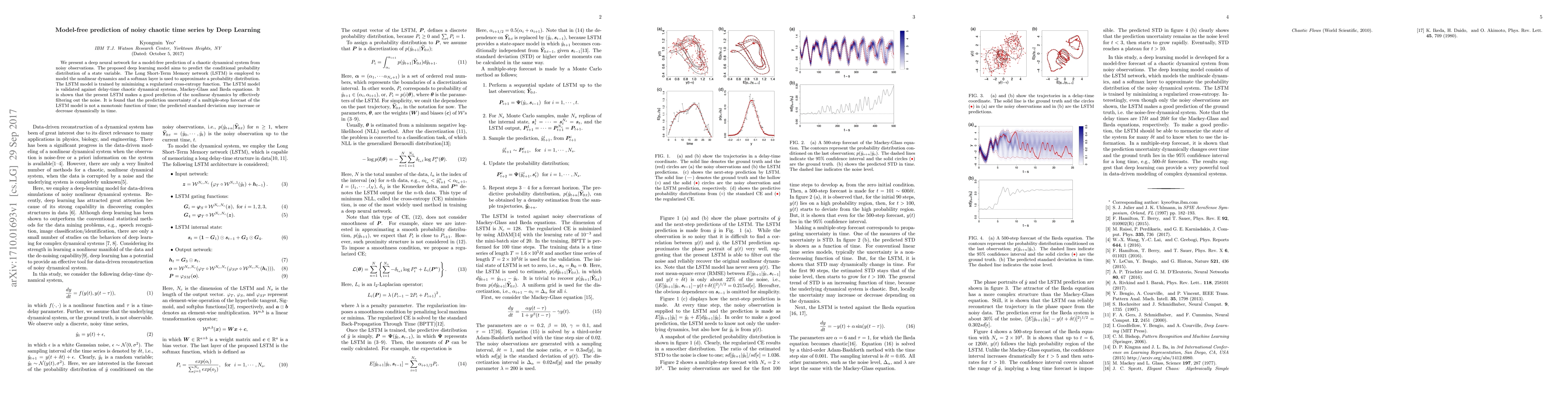 We present a deep neural network for a model-free prediction of a chaotic dynamical system from noisy observations. The proposed deep learning model aims to predict the conditional probability distribution of a state variable. The Long Short-Term Memory network (LSTM) is employed to model the nonlinear dynamics and a softmax layer is used to approximate a probability distribution. The LSTM model is trained by minimizing a regularized cross-entropy function. The LSTM model is validated against delay-time chaotic dynamical systems, Mackey-Glass and Ikeda equations. It is shown that the present LSTM makes a good prediction of the nonlinear dynamics by effectively filtering out the noise. It is found that the prediction uncertainty of a multiple-step forecast of the LSTM model is not a monotonic function of time; the predicted standard deviation may increase or decrease dynamically in time.