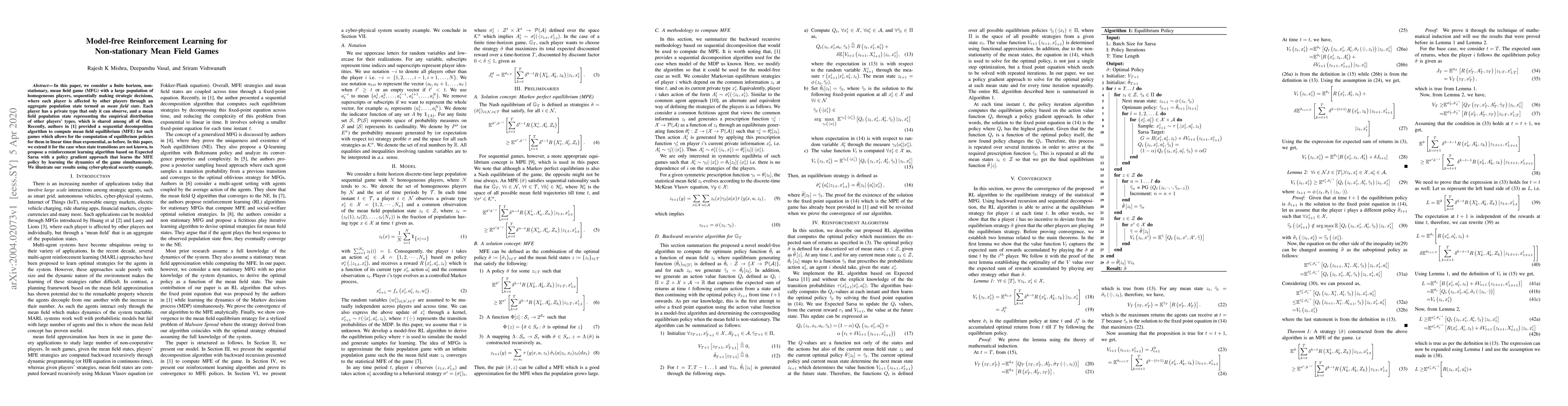 This paper proposes a model-free reinforcement learning algorithm based on Expected Sarsa with a policy gradient approach to compute mean field equilibrium policies for non-stationary, large population mean field games. The method learns the dynamics and equilibrium policies simultaneously without prior knowledge of state transitions.