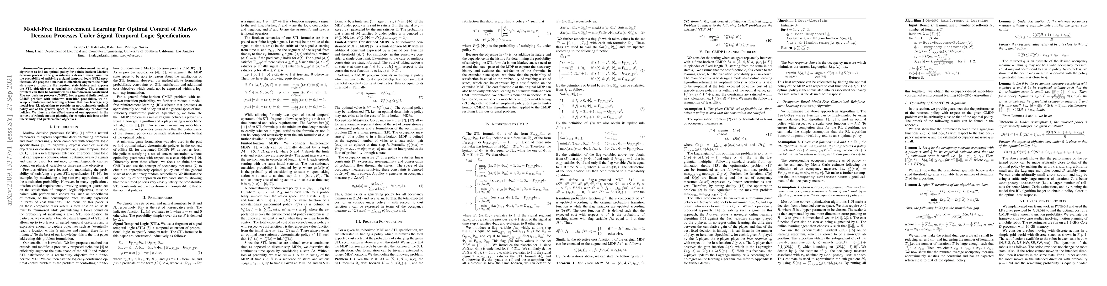 This paper introduces a model-free reinforcement learning algorithm for optimal control of Markov decision processes under signal temporal logic specifications. It proposes an augmented state space and formulates the planning problem as a constrained Markov decision process, achieving an approximately optimal policy for complex robotic motion planning.