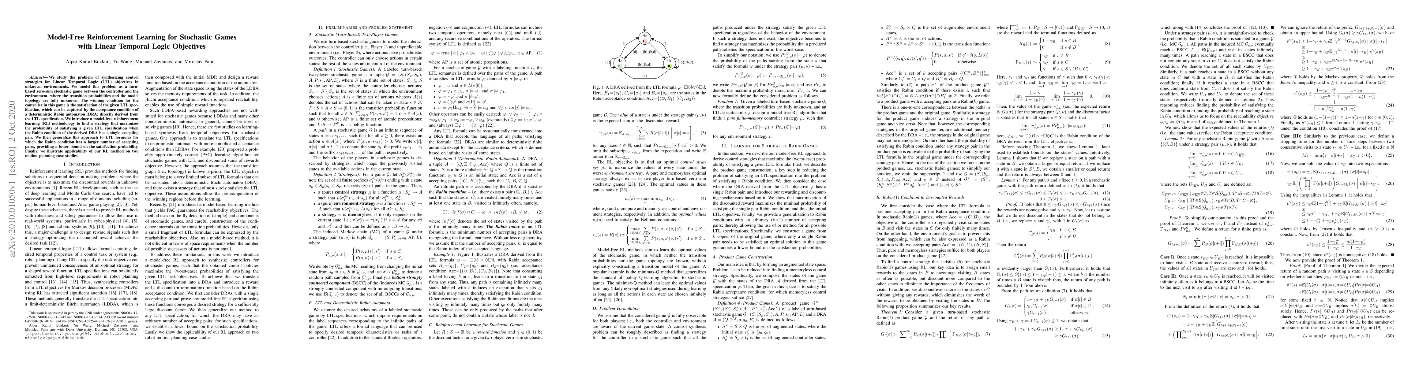 This paper proposes a model-free reinforcement learning approach to synthesize control strategies for satisfying Linear Temporal Logic objectives in unknown environments. The method is applied to stochastic games where the environment's model is unknown, and it generalizes to LTL specifications with multiple accepting pairs.