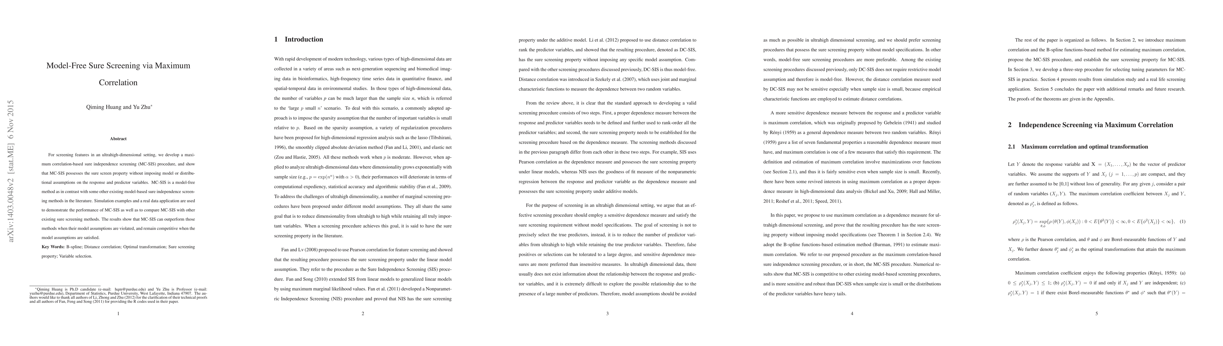 The paper introduces MC-SIS, a model-free feature screening method based on maximum correlation, which ensures the sure screening property without requiring model or distributional assumptions. Simulation and real data comparisons show that MC-SIS outperforms other methods when their assumptions are violated, while remaining competitive otherwise.