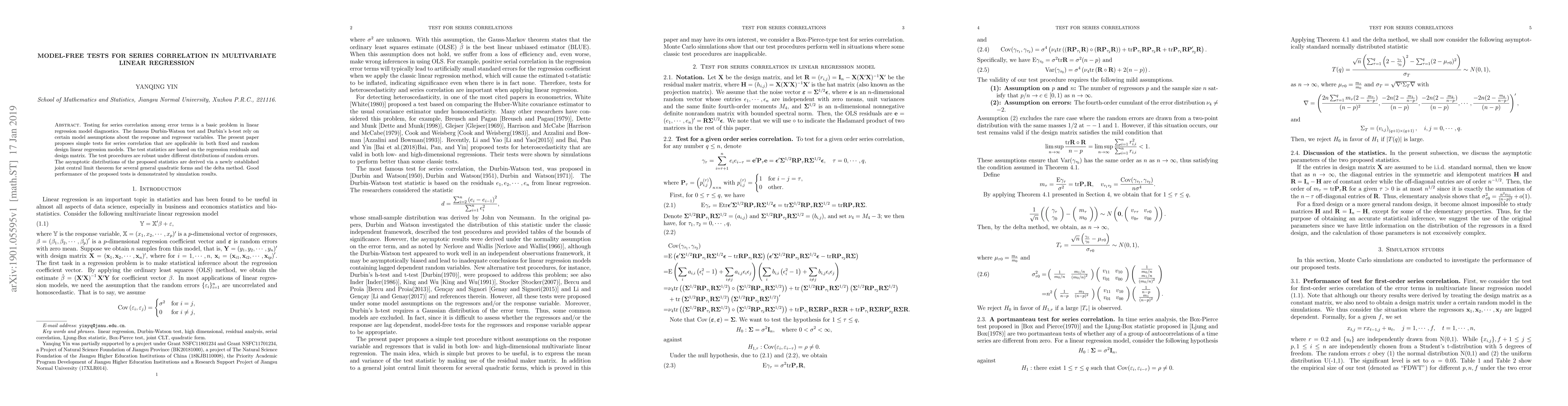 This paper introduces model-free tests for series correlation in multivariate linear regression, applicable to both fixed and random design models, relying on regression residuals and design matrix. The tests are robust across different error distributions, and their performance is validated through simulation results.