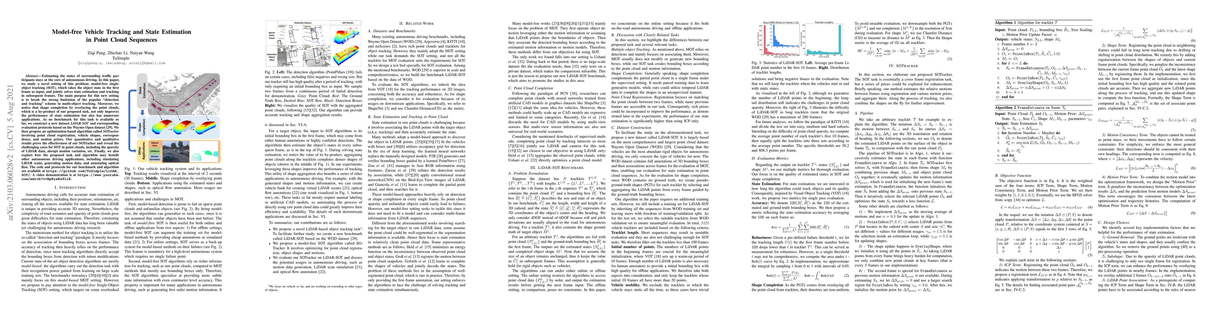 This paper introduces a model-free single-object tracking (SOT) algorithm for estimating vehicle states in point cloud sequences, aiming to overcome the limitations of traditional "detection and tracking" methods. The proposed SOTracker algorithm leverages point cloud registration and shape completion, and is evaluated on a new dataset, LiDAR-SOT, constructed from the Waymo Open dataset.
