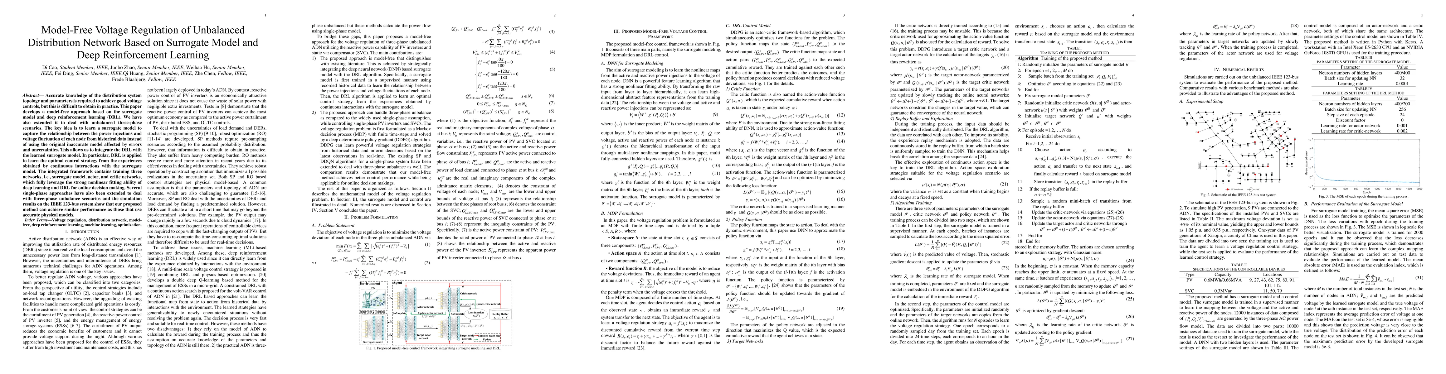 Accurate knowledge of the distribution system topology and parameters is required to achieve good voltage controls, but this is difficult to obtain in practice. This paper develops a model-free approach based on the surrogate model and deep reinforcement learning (DRL). We have also extended it to deal with unbalanced three-phase scenarios. The key idea is to learn a surrogate model to capture the relationship between the power injections and voltage fluctuation of each node from historical data instead of using the original inaccurate model affected by errors and uncertainties. This allows us to integrate the DRL with the learned surrogate model. In particular, DRL is applied to learn the optimal control strategy from the experiences obtained by continuous interactions with the surrogate model. The integrated framework contains training three networks, i.e., surrogate model, actor, and critic networks, which fully leverage the strong nonlinear fitting ability of deep learning and DRL for online decision making. Several single-phase approaches have also been extended to deal with three-phase unbalance scenarios and the simulation results on the IEEE 123-bus system show that our proposed method can achieve similar performance as those that use accurate physical models.