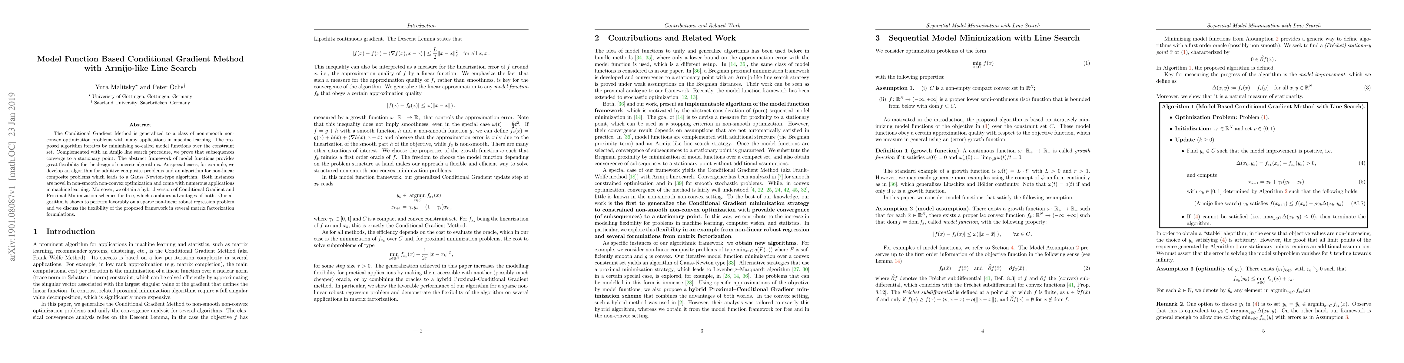 The Conditional Gradient Method is generalized to a class of non-smooth non-convex optimization problems with many applications in machine learning. The proposed algorithm iterates by minimizing so-called model functions over the constraint set. Complemented with an Amijo line search procedure, we prove that subsequences converge to a stationary point. The abstract framework of model functions provides great flexibility for the design of concrete algorithms. As special cases, for example, we develop an algorithm for additive composite problems and an algorithm for non-linear composite problems which leads to a Gauss--Newton-type algorithm. Both instances are novel in non-smooth non-convex optimization and come with numerous applications in machine learning. Moreover, we obtain a hybrid version of Conditional Gradient and Proximal Minimization schemes for free, which combines advantages of both. Our algorithm is shown to perform favorably on a sparse non-linear robust regression problem and we discuss the flexibility of the proposed framework in several matrix factorization formulations.
