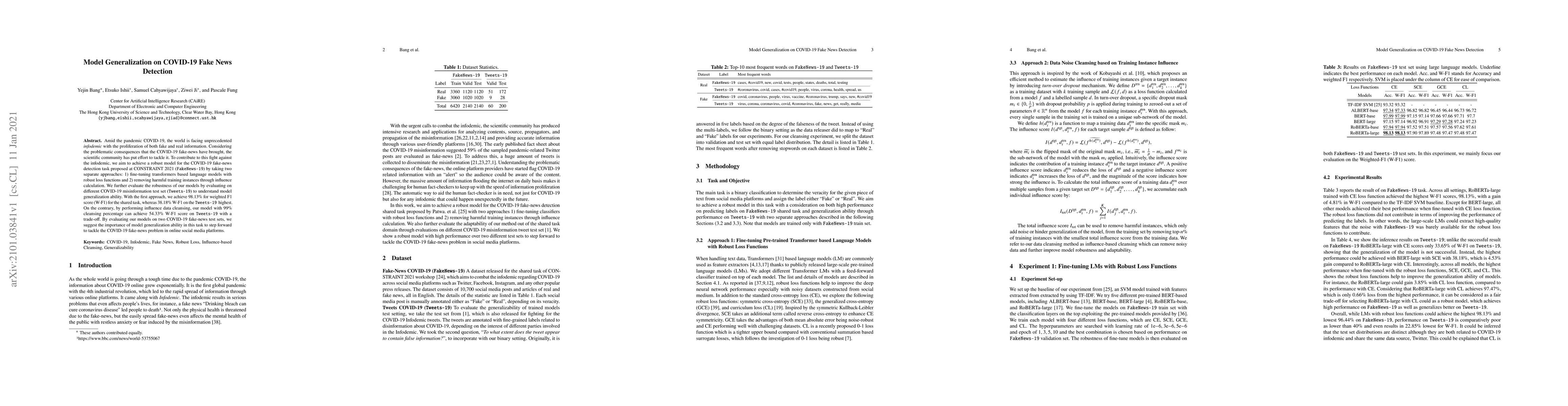 Amid the pandemic COVID-19, the world is facing unprecedented infodemic with the proliferation of both fake and real information. Considering the problematic consequences that the COVID-19 fake-news have brought, the scientific community has put effort to tackle it. To contribute to this fight against the infodemic, we aim to achieve a robust model for the COVID-19 fake-news detection task proposed at CONSTRAINT 2021 (FakeNews-19) by taking two separate approaches: 1) fine-tuning transformers based language models with robust loss functions and 2) removing harmful training instances through influence calculation. We further evaluate the robustness of our models by evaluating on different COVID-19 misinformation test set (Tweets-19) to understand model generalization ability. With the first approach, we achieve 98.13% for weighted F1 score (W-F1) for the shared task, whereas 38.18% W-F1 on the Tweets-19 highest. On the contrary, by performing influence data cleansing, our model with 99% cleansing percentage can achieve 54.33% W-F1 score on Tweets-19 with a trade-off. By evaluating our models on two COVID-19 fake-news test sets, we suggest the importance of model generalization ability in this task to step forward to tackle the COVID-19 fake-news problem in online social media platforms.