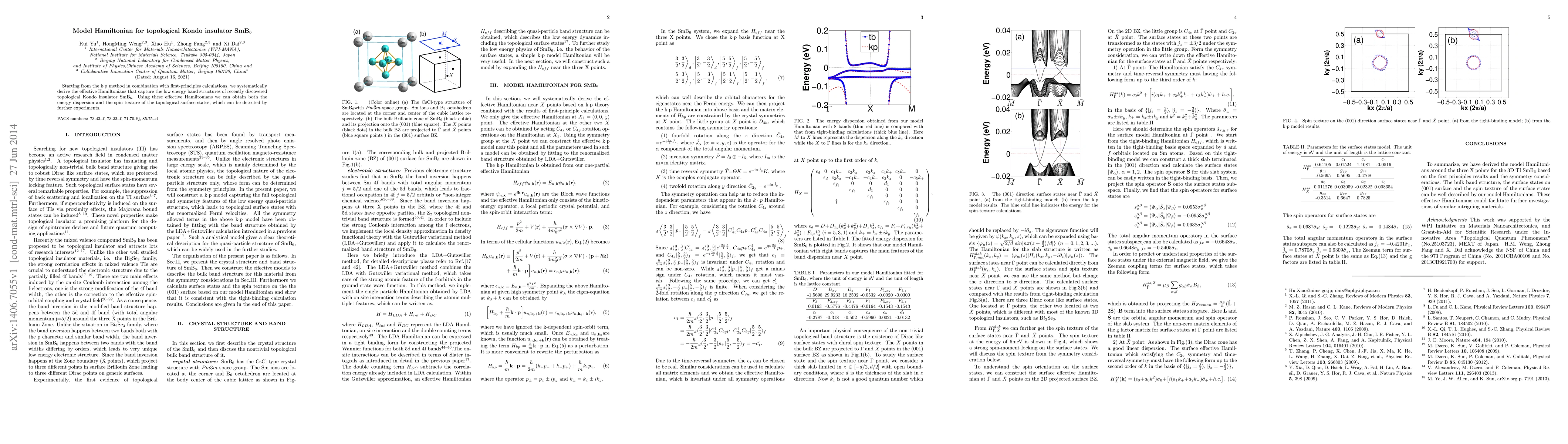 This paper derives effective Hamiltonians for the topological Kondo insulator SmB6 using the kp method and first-principles calculations, providing a detailed model for the low-energy band structure and predicting the energy dispersion and spin texture of its topological surface states. These findings can guide future experimental investigations.