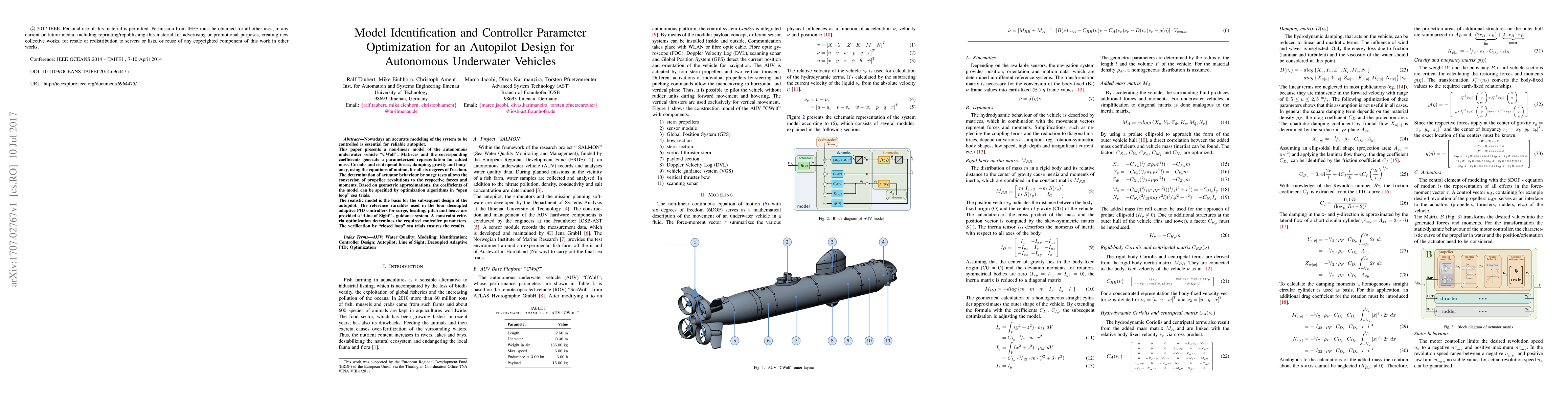Nowadays an accurate modeling of the system to be controlled is essential for reliable autopilot. This paper presents a non-linear model of the autonomous underwater vehicle 'CWolf'. Matrices and the corresponding coefficients generate a parameterized representation for added mass, Coriolis and centripetal forces, damping, gravity and buoyancy, using the equations of motion, for all six degrees of freedom. The determination of actuator behaviour by surge tests allows the conversion of propeller revolutions to the respective forces and moments. Based on geometric approximations, the coefficients of the model can be specified by optimization algorithms in 'open loop' sea trials. The realistic model is the basis for the subsequent design of the autopilot. The reference variables used in the four decoupled adaptive PID controllers for surge, heading, pitch and heave are provided a 'Line of Sight' - guidance system. A constraint criteria optimization determines the required controller parameters. The verification by 'closed loop' sea trials ensures the results.
