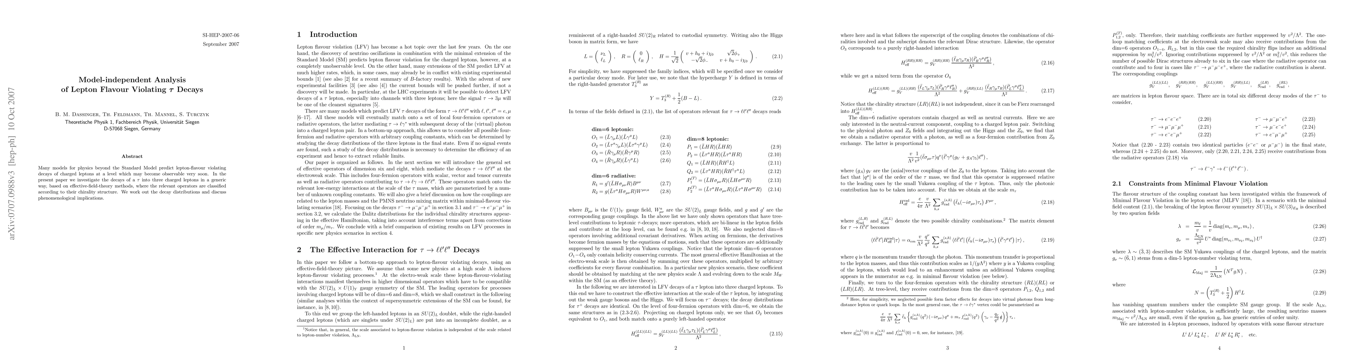 This paper employs effective-field-theory methods to analyze lepton-flavour-violating tau decays into three charged leptons, classifying operators by chirality and exploring their decay distributions and phenomenological implications.