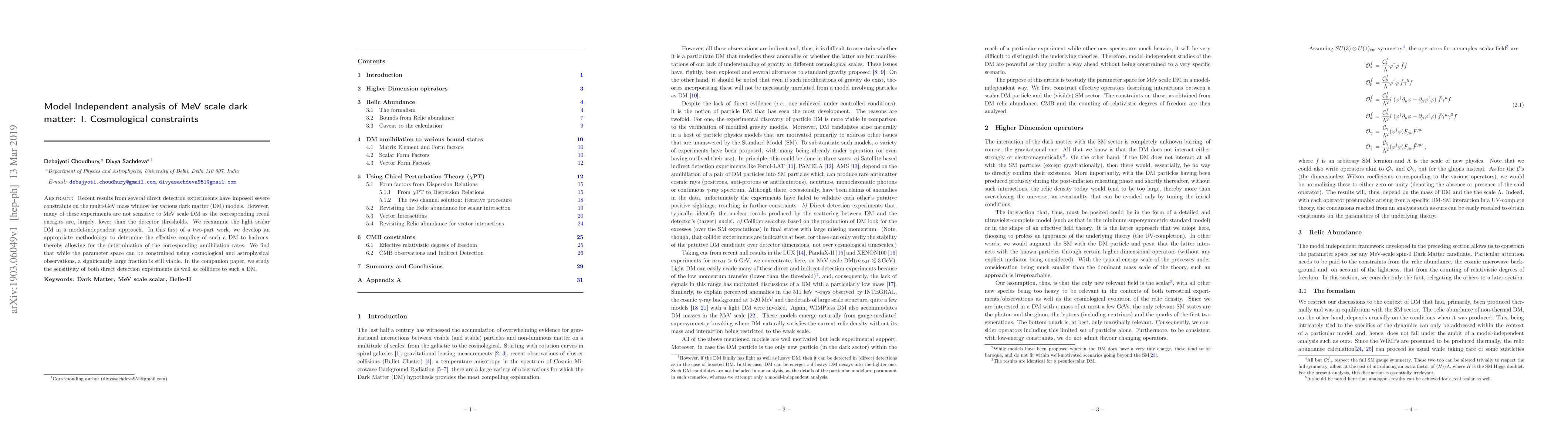 Recent results from several direct detection experiments have imposed severe constraints on the multi-GeV mass window for various dark matter (DM) models. However, many of these experiments are not sensitive to MeV scale DM as the corresponding recoil energies are, largely, lower than the detector thresholds. We reexamine the light scalar DM in a model-independent approach. In this first of a two-part work, we develop an appropriate methodology to determine the effective coupling of such a DM to hadrons, thereby allowing for the determination of the corresponding annihilation rates. We find that while the parameter space can be constrained using cosmological and astrophysical observations, a significantly large fraction is still viable. In the companion paper, we study the sensitivity of both direct detection experiments as well as colliders to such a DM.