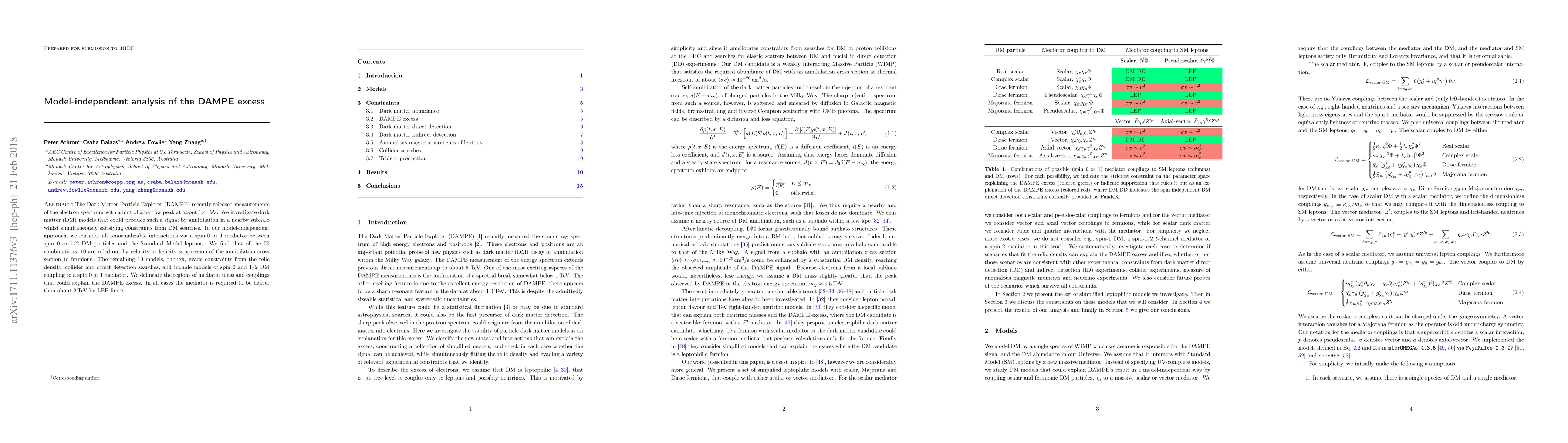 The study performs a model-independent analysis of dark matter (DM) explanations for the DAMPE electron spectrum peak, considering all renormalizable interactions via a spin 0 or 1 mediator between spin 0 or 1/2 DM particles and Standard Model leptons.