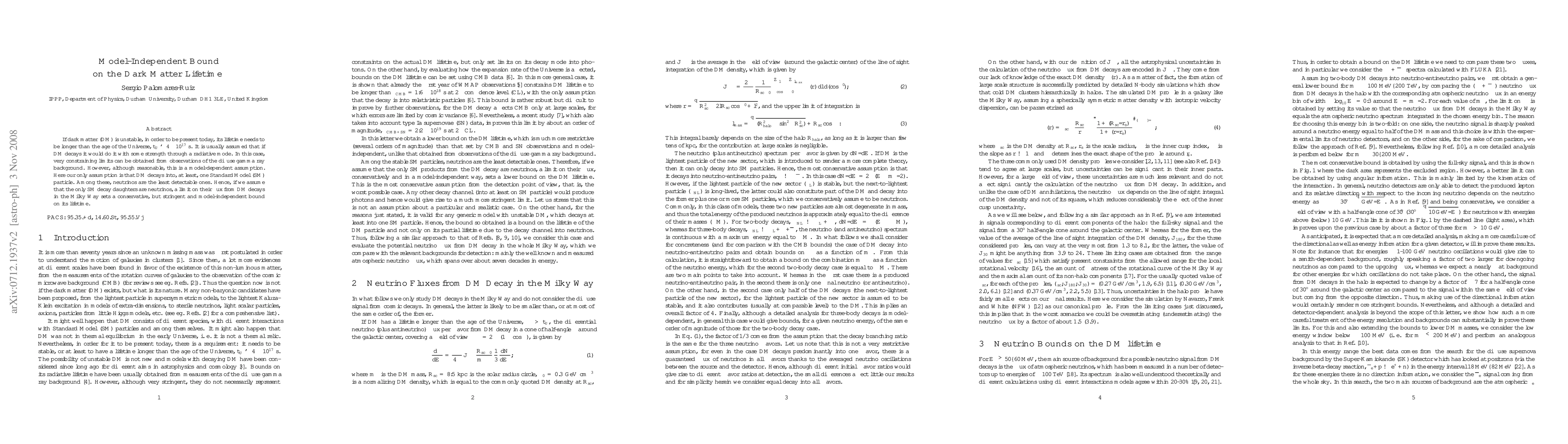 If dark matter (DM) is unstable, in order to be present today, its lifetime needs to be longer than the age of the Universe, t_U ~ 4 10^{17} s. It is usually assumed that if DM decays it would do it with some strength through a radiative mode. In this case, very constraining limits can be obtained from observations of the diffuse gamma ray background. However, although reasonable, this is a model-dependent assumption. Here our only assumption is that DM decays into, at least, one Standard Model (SM) particle. Among these, neutrinos are the least detectable ones. Hence, if we assume that the only SM decay daughters are neutrinos, a limit on their flux from DM decays in the Milky Way sets a conservative, but stringent and model-independent bound on its lifetime.