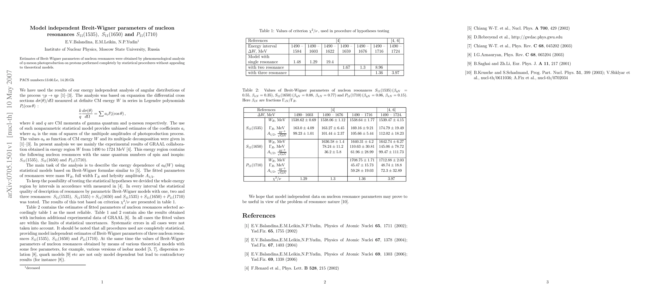 Researchers used statistical analysis to estimate Breit-Wigner parameters of nucleon resonances, specifically S11(1535), S11(1650), and P11(1710), without relying on theoretical models or experimental data.