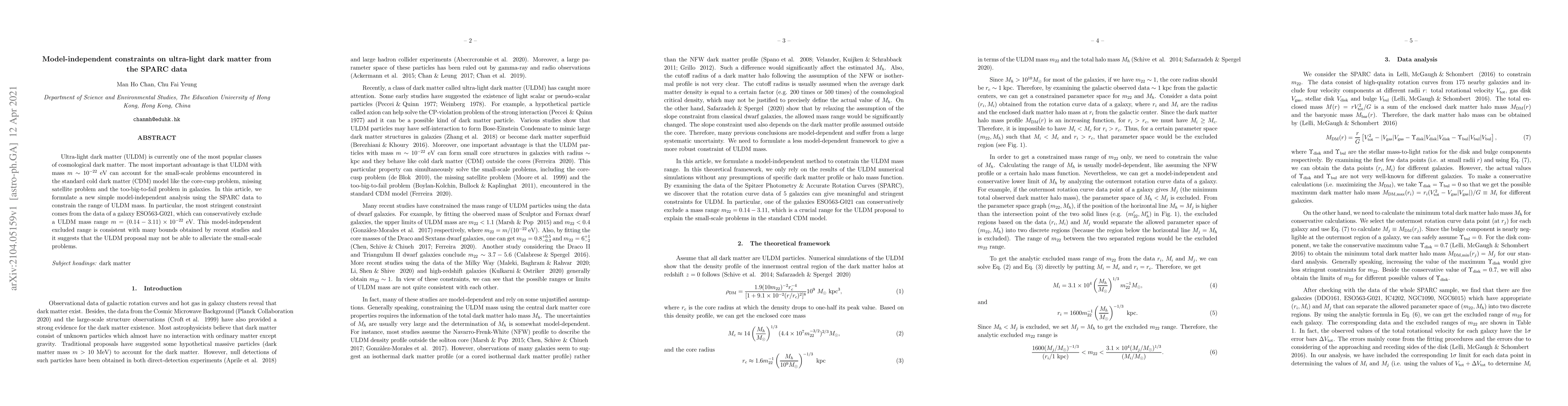 Ultra-light dark matter (ULDM) is currently one of the most popular classes of cosmological dark matter. The most important advantage is that ULDM with mass $m \sim 10^{-22}$ eV can account for the small-scale problems encountered in the standard cold dark matter (CDM) model like the core-cusp problem, missing satellite problem and the too-big-to-fail problem in galaxies. In this article, we formulate a new simple model-independent analysis using the SPARC data to constrain the range of ULDM mass. In particular, the most stringent constraint comes from the data of a galaxy ESO563-G021, which can conservatively exclude a ULDM mass range $m=(0.14-3.11)\times 10^{-22}$ eV. This model-independent excluded range is consistent with many bounds obtained by recent studies and it suggests that the ULDM proposal may not be able to alleviate the small-scale problems.