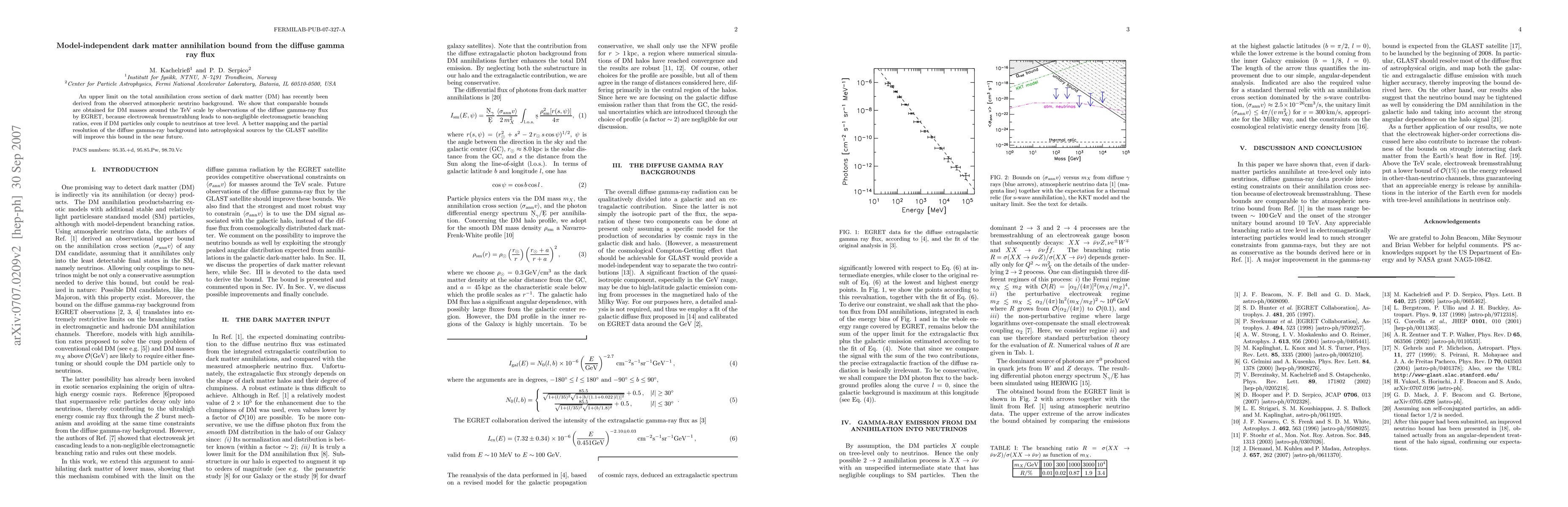 An upper limit on the total annihilation cross section of dark matter (DM) has recently been derived from the observed atmospheric neutrino background. We show that comparable bounds are obtained for DM masses around the TeV scale by observations of the diffuse gamma-ray flux by EGRET, because electroweak bremsstrahlung leads to non-negligible electromagnetic branching ratios, even if DM particles only couple to neutrinos at tree level. A better mapping and the partial resolution of the diffuse gamma-ray background into astrophysical sources by the GLAST satellite will improve this bound in the near future.
