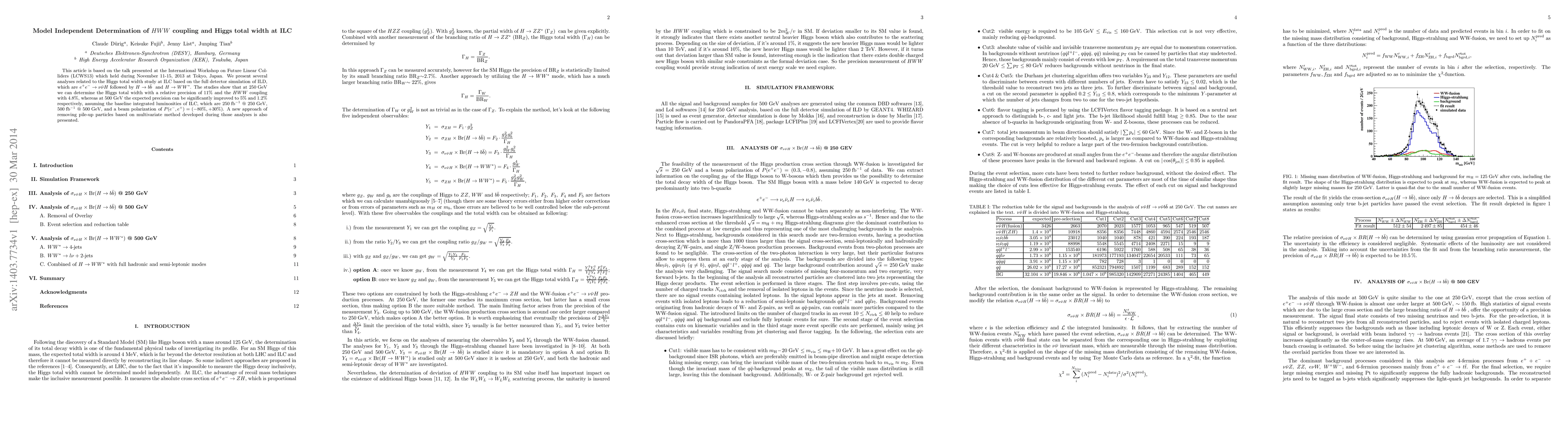 This article is based on the talk presented at the International Workshop on Future Linear Colliders (LCWS13) which held during November 11-15, 2013 at Tokyo, Japan. We present several analyses related to the Higgs total width study at ILC based on the full detector simulation of ILD, which are \eevvH followed by \Htobb and \HtoWW. The studies show that at $\unit{250}{GeV}$ we can determine the Higgs total width with a relative precision of 11% and the $HWW$ coupling with 4.8%, whereas at $\unit{500}{GeV}$ the expected precision can be significantly improved to 5% and 1.2% respectively, assuming the baseline integrated luminosities of ILC, which are $\unit{250}{fb^{-1}}$ @ $\unit{250}{GeV}$, $\unit{500}{fb^{-1}}$ @ $\unit{500}{GeV}$, and a beam polarization of $P(e^{-},e^{+})=(-80%,+30%)$. A new approach of removing pile-up particles based on multivariate method developed during those analyses is also presented.