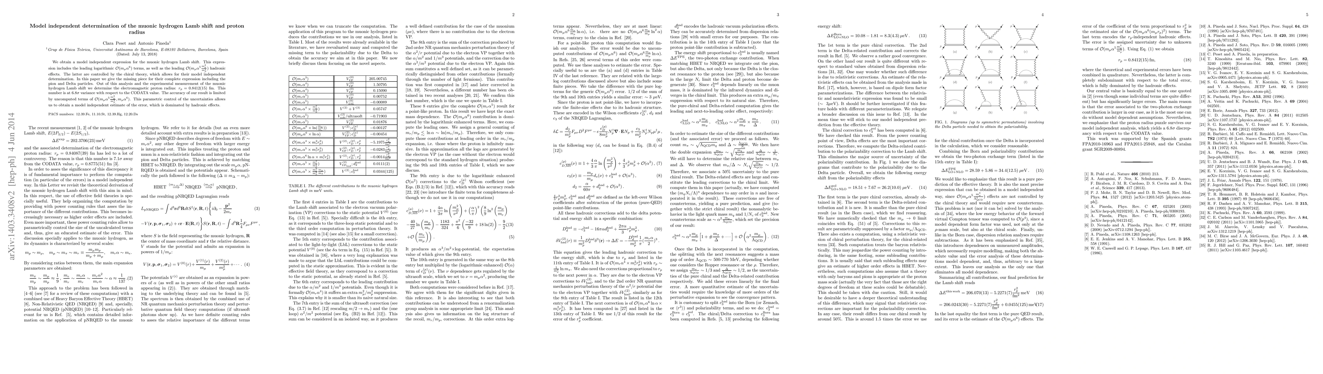 We obtain a model independent expression for the muonic hydrogen Lamb shift. This expression includes the leading logarithmic ${\cal O}(m_{\mu}\alpha^6)$ terms, as well as the leading ${\cal O}(m_{\mu}\alpha^5 \frac{m_{\mu}^2}{m_{\rho}^2})$ hadronic effects. The latter are controlled by the chiral theory, which allows for their model independent determination. In this paper we give the missing piece for their complete expression including the pion and Delta particles. Out of this analysis and the experimental measurement of the muonic hydrogen Lamb shift we determine the electromagnetic proton radius: $r_p=0.8412(15)$ fm. This number is at 6.8$\sigma$ variance with respect to the CODATA value. The accuracy of our result is limited by uncomputed terms of ${\cal O}(m_{\mu}\alpha^5\frac{m_{\mu}^3}{m_{\rho}^3},m_{\mu}\alpha^6)$. This parametric control of the uncertainties allows us to obtain a model independent determination of the error, which is dominated by hadronic effects.