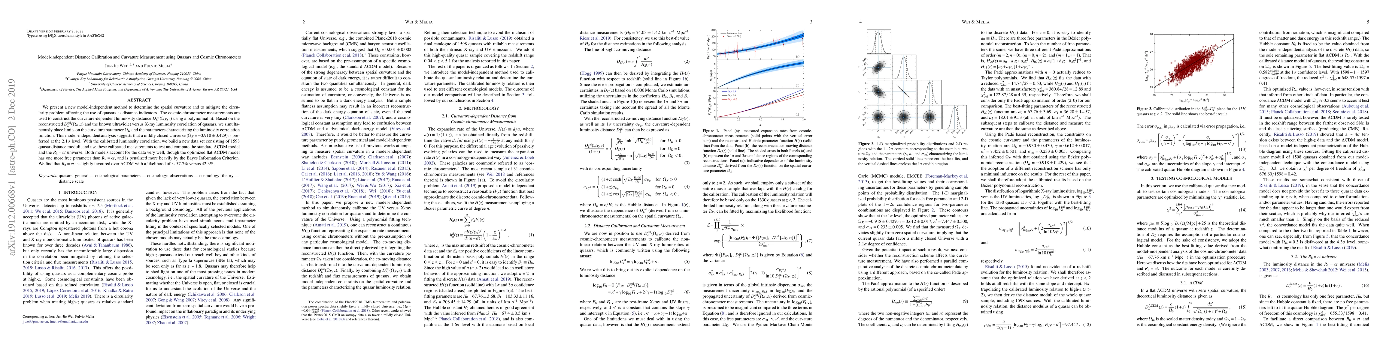 A new method to measure curvature using quasars and cosmic chronometers suggests a mildly closed Universe, while comparing two models of the universe finds that one with constant time scale is slightly favored over the standard LambdaCDM model.