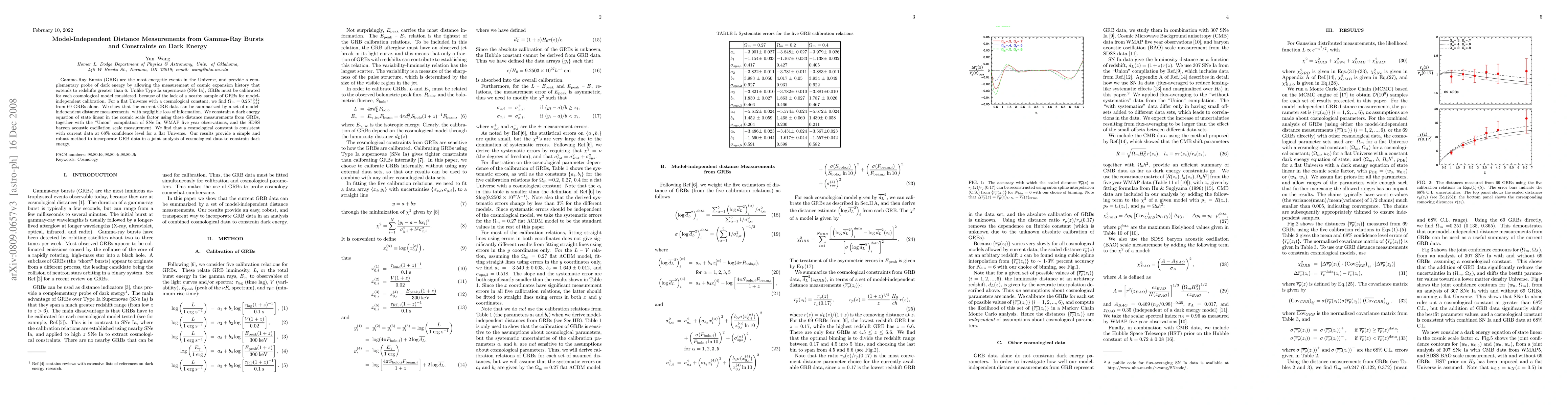 This paper presents model-independent distance measurements from Gamma-Ray Bursts (GRBs) to probe dark energy, finding Ω_m=0.25^{+0.12}_{-0.11} from 69 GRBs. It concludes that GRB data can constrain a dark energy equation of state, consistent with a cosmological constant at 68% confidence level when combined with other cosmological data.