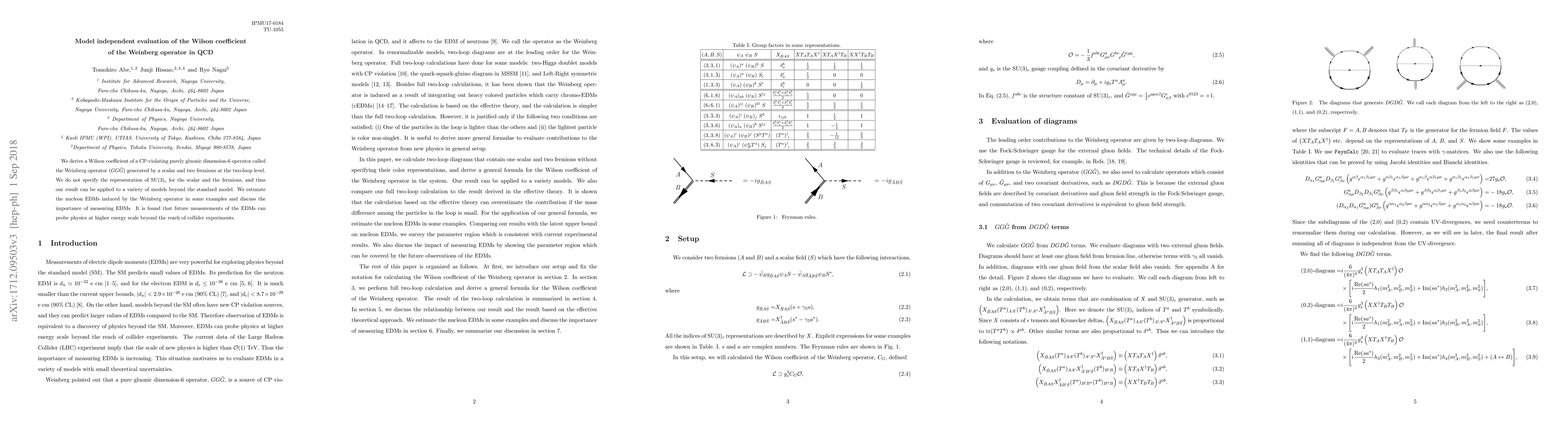 We derive a Wilson coefficient of a CP-violating purely gluonic dimension-6 operator called the Weinberg operator ($GG\tilde{G}$) generated by a scalar and two fermions at the two-loop level. We do not specify the representation of SU(3)$_c$ for the scalar and the fermions, and thus our result can be applied to a variety of models beyond the standard model. We estimate the nucleon EDMs induced by the Weinberg operator in some examples and discuss the importance of measuring EDMs. It is found that future measurements of the EDMs can probe physics at higher energy scale beyond the reach of collider experiments.