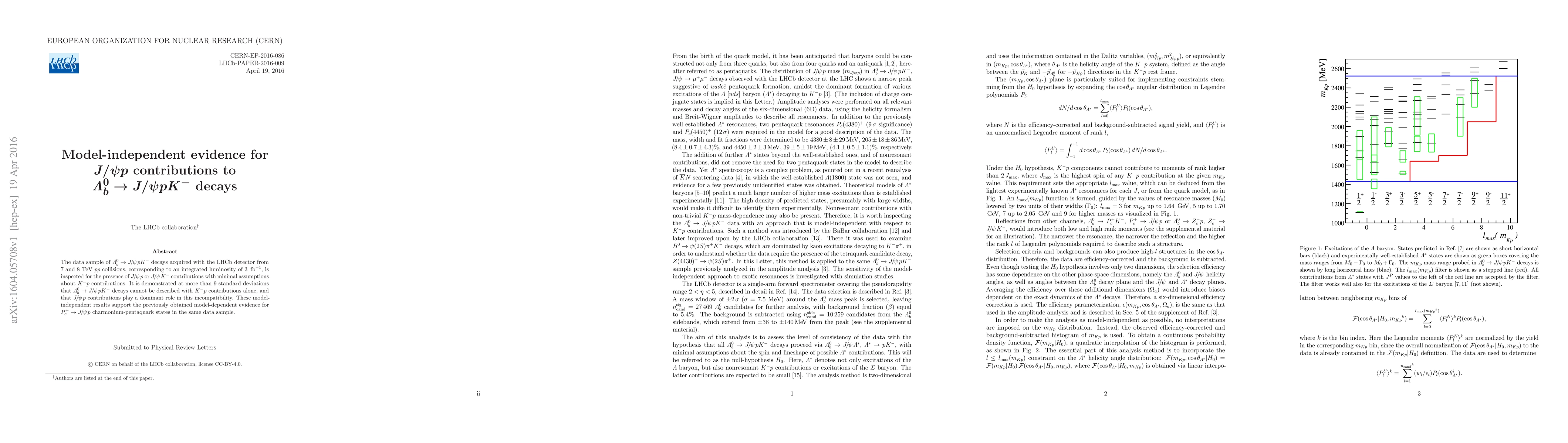 This study using LHCb data from 7 and 8 TeV proton-proton collisions finds strong evidence for $J/\psi p$ contributions in $\Lambda_b^0\to J/\psi p K^-$ decays, ruling out $K^- p$ contributions alone at more than 9 standard deviations. These model-independent findings corroborate previous model-dependent evidence for $P_c^+\to J/\psi p$ charmonium-pentaquark states.
