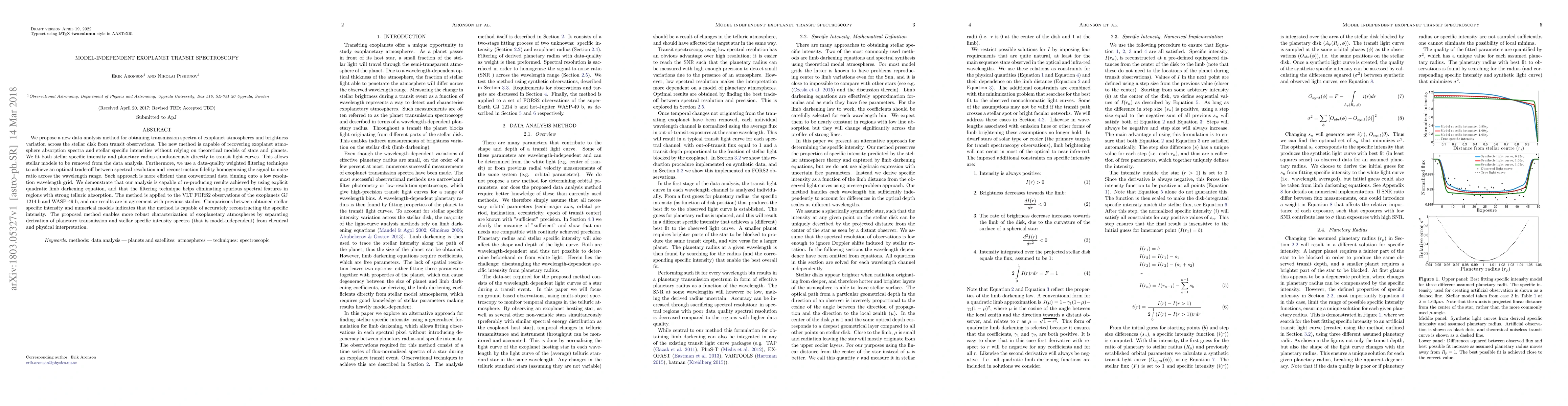 We propose a new data analysis method for obtaining transmission spectra of exoplanet atmospheres and brightness variation across the stellar disk from transit observations. The new method is capable of recovering exoplanet atmosphere absorption spectra and stellar specific intensities without relying on theoretical models of stars and planets. We fit both stellar specific intensity and planetary radius simultaneously directly to transit light curves. This allows stellar models to be removed from the data analysis. Furthermore, we use a data-quality weighted filtering technique to achieve an optimal trade-off between spectral resolution and reconstruction fidelity homogenising the signal to noise ratio across the wavelength range. Such approach is more efficient than conventional data binning onto a low resolution wavelength grid. We demonstrate that our analysis is capable of re-producing results achieved by using explicit quadratic limb darkening equation, and that the filtering technique helps eliminating spurious spectral features in regions with strong telluric absorption. The method is applied to the VLT FORS2 observations of the exoplanets GJ 1214 b and WASP-49 b, and our results are in agreement with previous studies. Comparisons between obtained stellar specific intensity and numerical models indicates that the method is capable of accurately reconstructing the specific intensity. The proposed method enables more robust characterization of exoplanetary atmospheres by separating derivation of planetary transmission and stellar specific intensity spectra (that is model-independent) from chemical and physical interpretation.