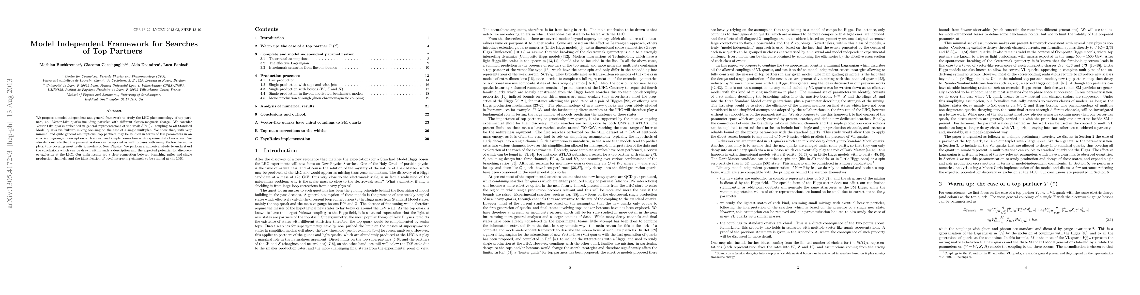We propose a model-independent and general framework to study the LHC phenomenology of top partners, i.e. Vector-Like quarks including particles with different electro-magnetic charge. We consider Vector-Like quarks embedded in general representations of the weak SU(2)L, coupling to all Standard Model quarks via Yukawa mixing focusing on the case of a single multiplet. We show that, with very minimal and quite general assumptions, top partners may be studied in terms of few parameters in an effective Lagrangian description with a clear and simple connection with experimental observables. We also demonstrate that the parametrisation can be applied as well to cases with many Vector-like multiplets, thus covering most realistic models of New Physics. We perform a numerical study to understand the conclusions which can be drawn within such a description and the expected potential for discovery or exclusion at the LHC. Our main results are a clear connection between branching ratios and single production channels, and the identification of novel interesting channels to be studied at the LHC.