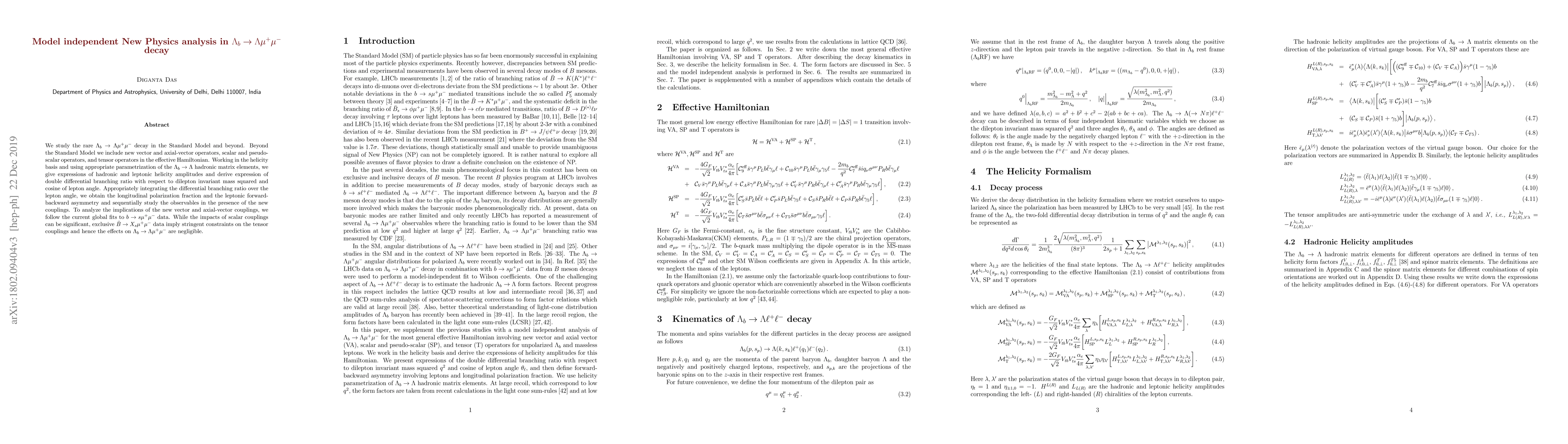 We study the rare $\Lambda_b\to\Lambda\mu^+\mu^-$ decay in the Standard Model and beyond. Beyond the Standard Model we include new vector and axial-vector operators, scalar and pseudo-scalar operators, and tensor operators in the effective Hamiltonian. Working in the helicity basis and using appropriate parametrization of the $\Lambda_b \to \Lambda$ hadronic matrix elements, we give expressions of hadronic and leptonic helicity amplitudes and derive expression of double differential branching ratio with respect to dilepton invariant mass squared and cosine of lepton angle. Appropriately integrating the differential branching ratio over the lepton angle, we obtain the longitudinal polarization fraction and the leptonic forward-backward asymmetry and sequentially study the observables in the presence of the new couplings. To analyze the implications of the new vector and axial-vector couplings, we follow the current global fits to $b\to s\mu^+\mu^-$ data. While the impacts of scalar couplings can be significant, exclusive $\bar{B}\to X_s\mu^+\mu^-$ data imply stringent constraints on the tensor couplings and hence the effects on $\Lambda_b\to\Lambda\mu^+\mu^-$ are negligible.
