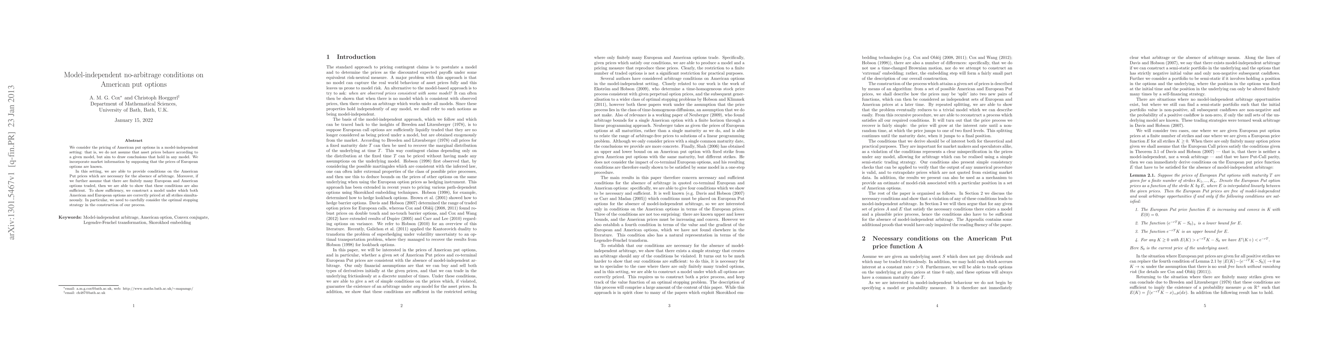 This paper establishes model-independent no-arbitrage conditions for American put options without assuming a specific asset price model. It shows that known European option prices provide necessary conditions for American put prices to avoid arbitrage, and under the assumption of finitely many traded options, these conditions are also sufficient.