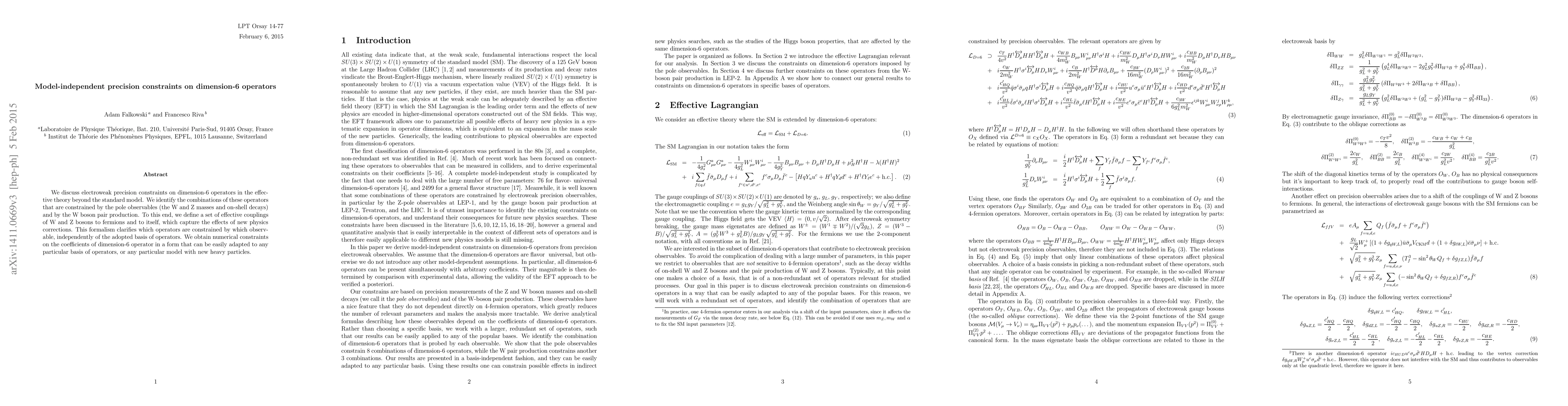 This paper establishes model-independent precision constraints on dimension-6 operators in the effective theory beyond the Standard Model, using electroweak precision tests and W boson pair production. It provides a clear framework for identifying which operators are constrained by specific observables, yielding numerical constraints adaptable to any new physics model.