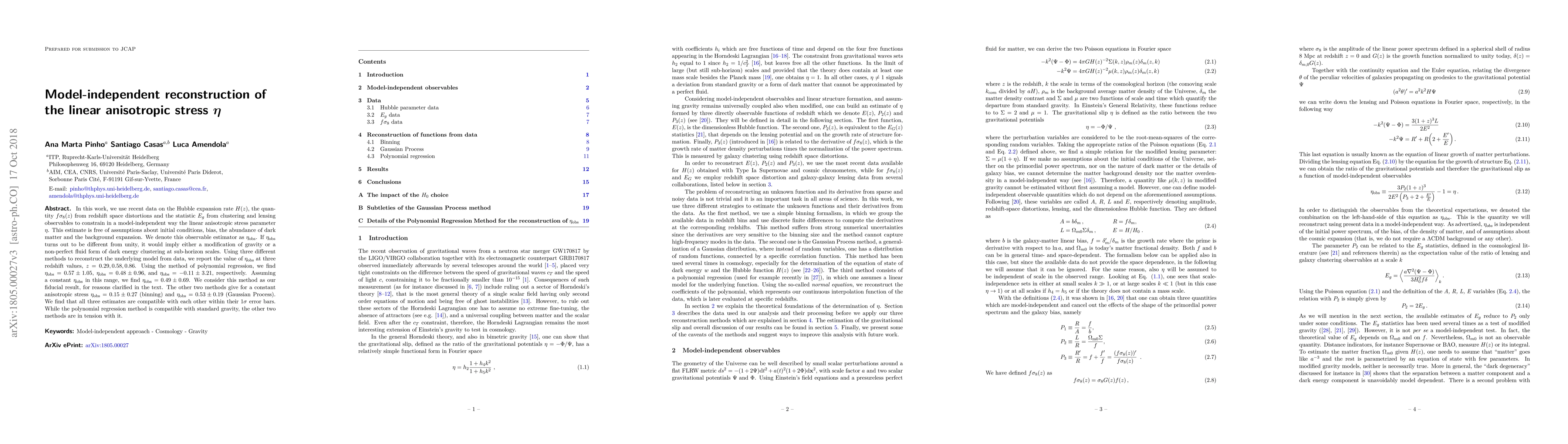 This paper reconstructs the linear anisotropic stress parameter $\eta$ using data from Hubble expansion, redshift space distortions, and clustering/lensing, without relying on specific cosmological models. The estimates suggest $\eta \approx 0.49 \pm 0.69$, indicating compatibility with standard gravity, though other methods hint at potential deviations.