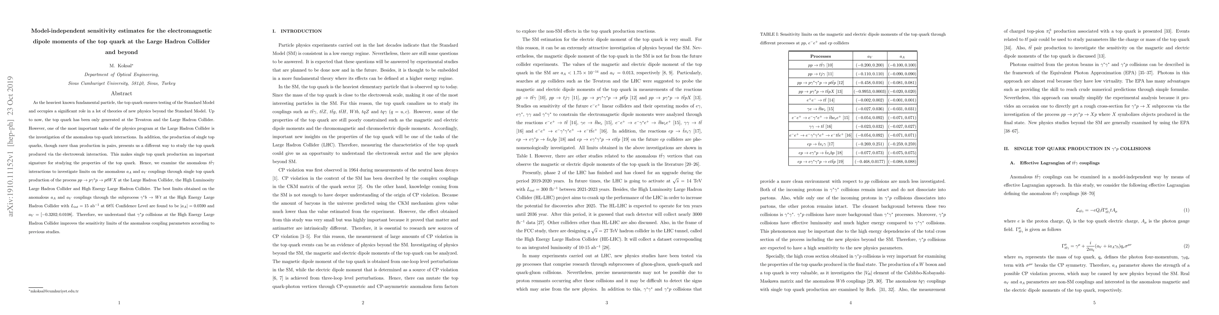 This paper investigates model-independent sensitivity estimates for the electromagnetic dipole moments of the top quark at the Large Hadron Collider (LHC) and future upgrades. It focuses on anomalous $t\bar{t}\gamma$ interactions and sets limits on $a_A$ and $a_V$ couplings through single top quark production, finding $|a_{A}|=0.0590$ and $a_{V}=[-0.3202;0.0108]$ at the High Energy LHC.
