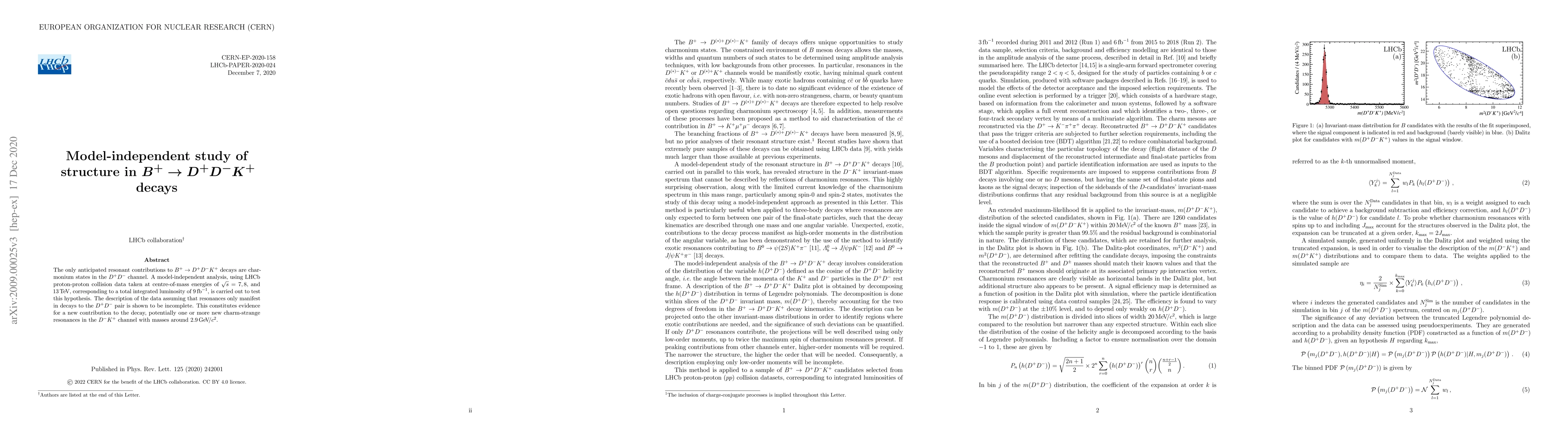 The only anticipated resonant contributions to $B^+\to D^+D^-K^+$ decays are charmonium states in the $D^+D^-$ channel. A model-independent analysis, using LHCb proton-proton collision data taken at centre-of-mass energies of $\sqrt{s}=7,8,$ and $13$ TeV, corresponding to a total integrated luminosity of 9 fb$^{-1}$, is carried out to test this hypothesis. The description of the data assuming that resonances only manifest in decays to the $D^+D^-$ pair is shown to be incomplete. This constitutes evidence for a new contribution to the decay, potentially one or more new charm-strange resonances in the $D^-K^+$ channel with masses around 2.9 GeV$/c^2$.
